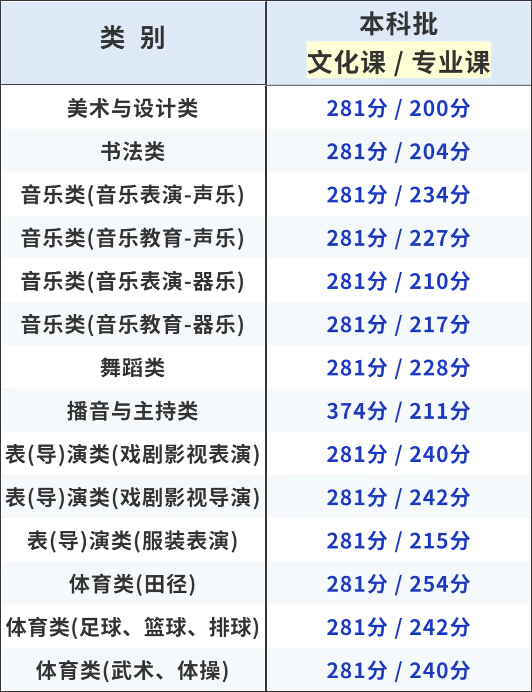 注:1.艺术类专业校考文化课录取最低控制分数线执行普通类录取最低控制分数线,即物理类374分,历史类412分,专业课合格,相应专业统考合格。2.戏曲类专业省际联考文化课录取最低控制分数线187分,专业课合格。