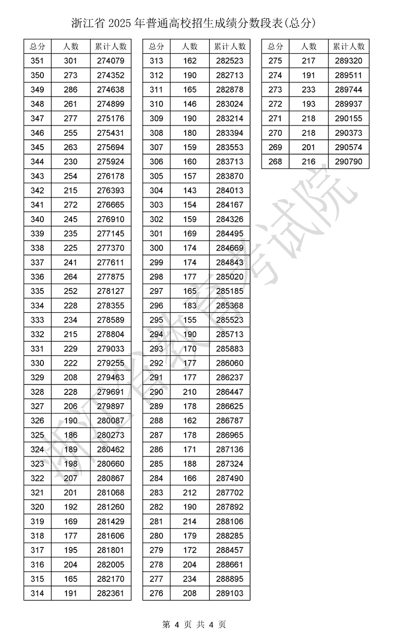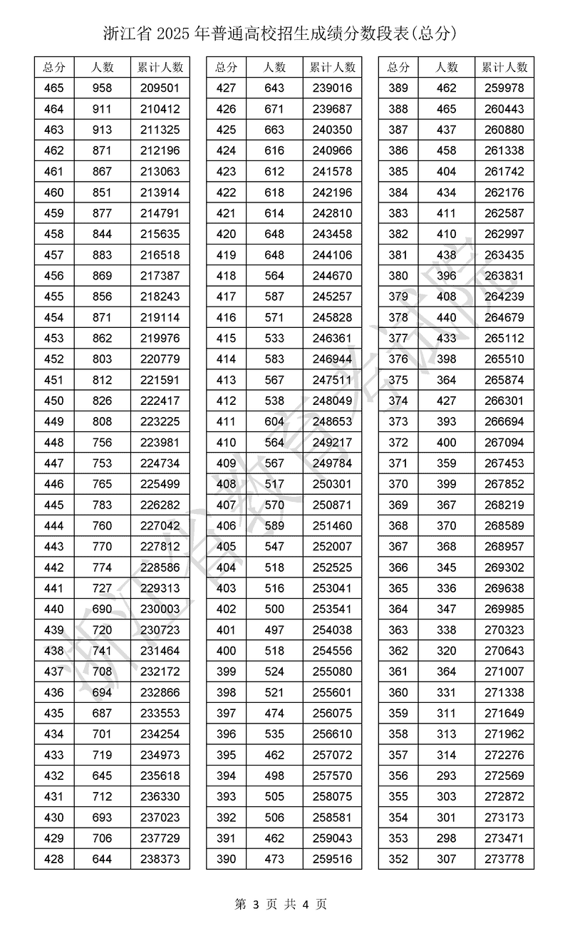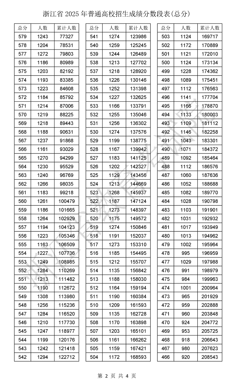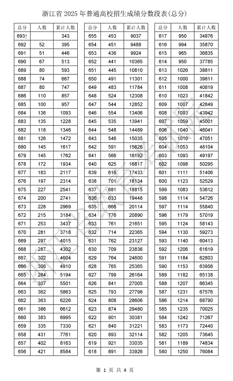 浙江省2025年普通高校招生成绩分数段表(总分)