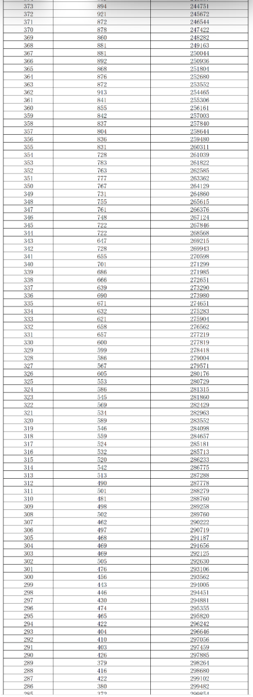 具体来说,一分一段表包含三个核心数据:分数、本分人数和累计人数。其中,分数指的是某个具体的分数,如600分;本分人数是指该分数对应的考生总数,例如600分有800人;累计人数则是指达到或超过该分数的考生总数,如600分累计5000人,意味着该考生在全省排名第5000名。
