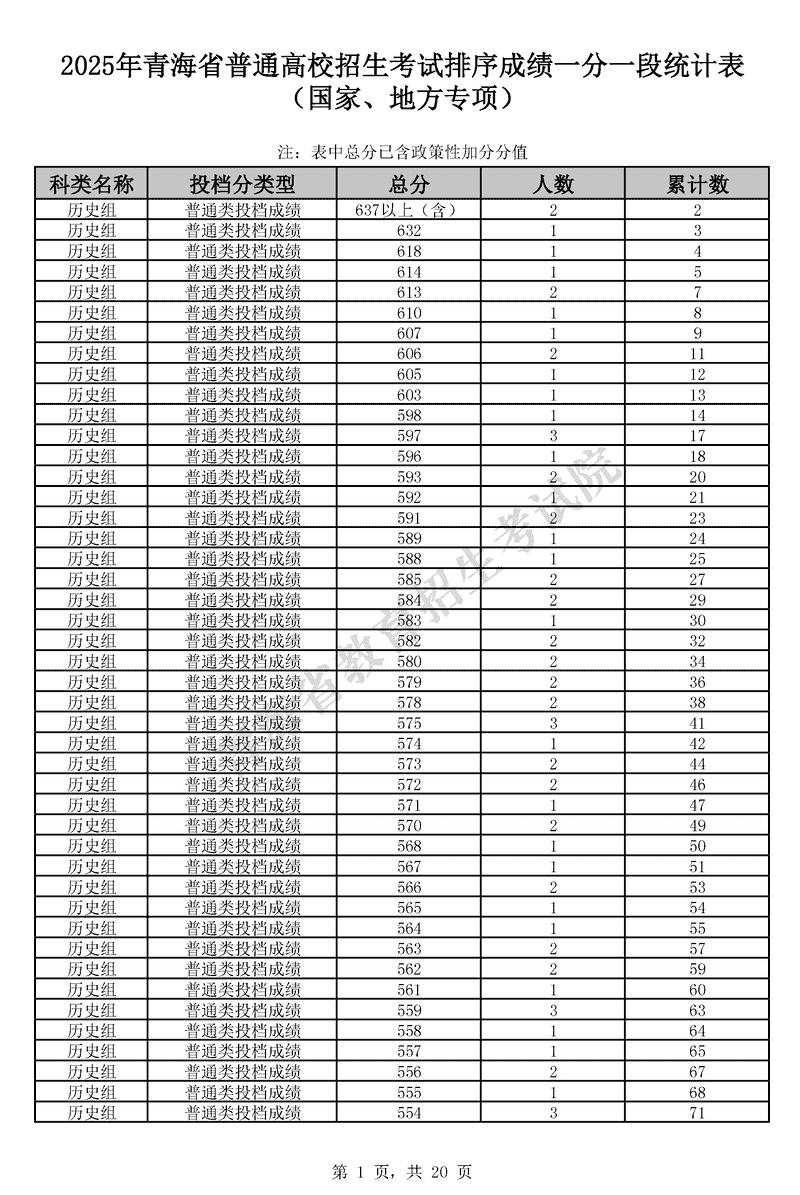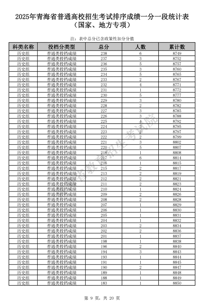 2025青海高考历史类一分一段表出炉 最新位次排名