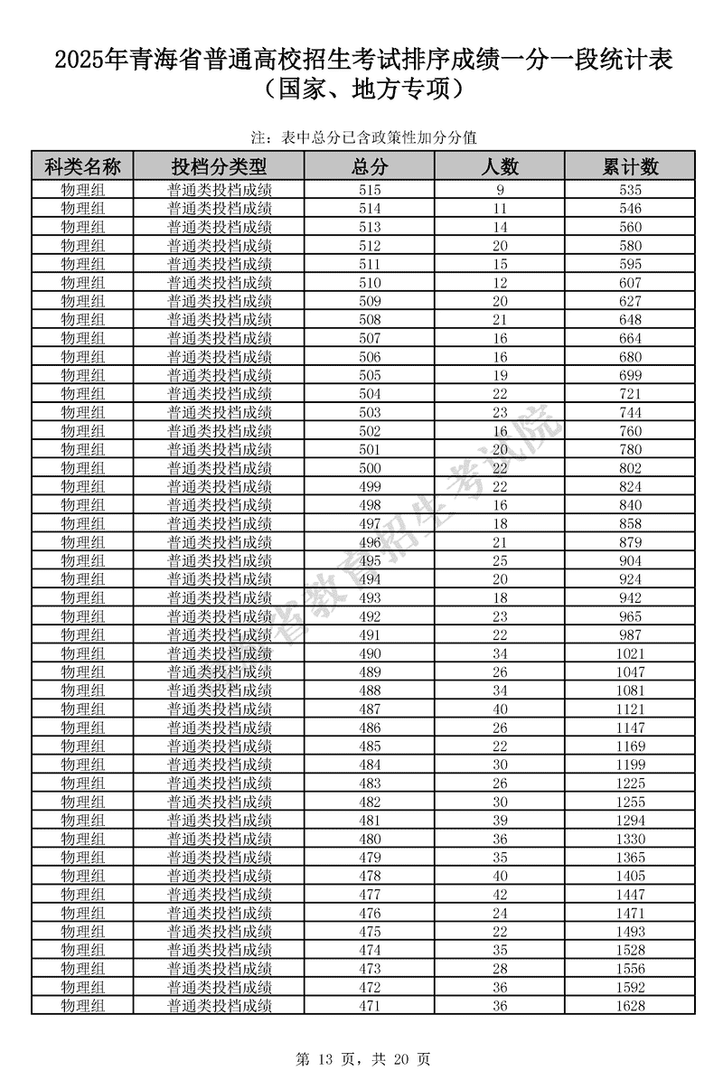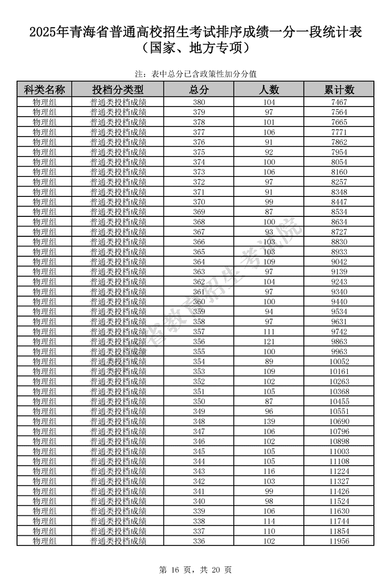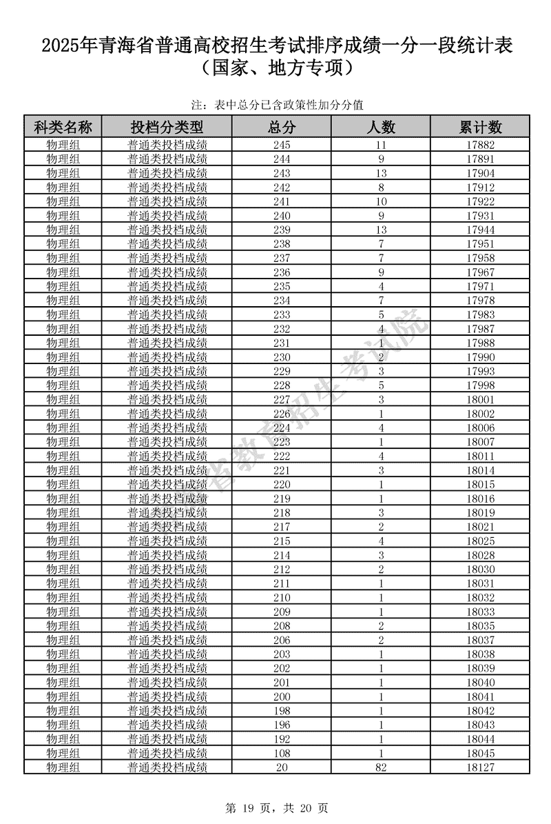 2025年青海高考排序成绩一分一段统计表(国家专项、地方专项)