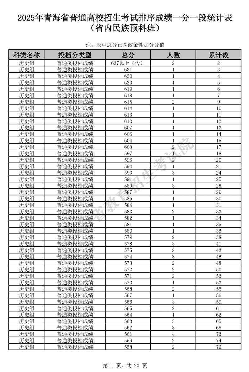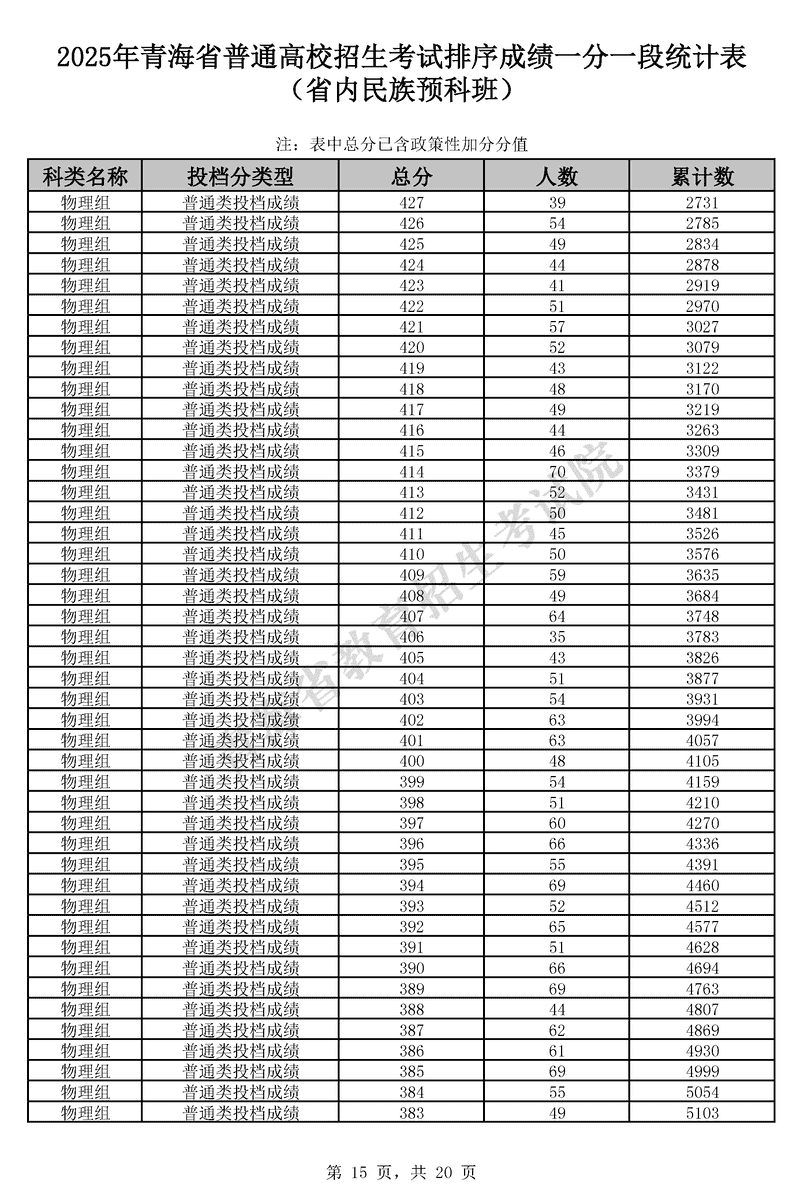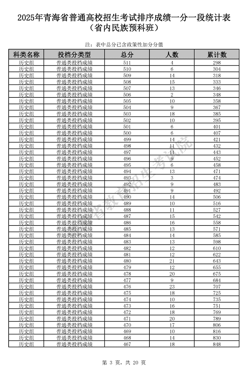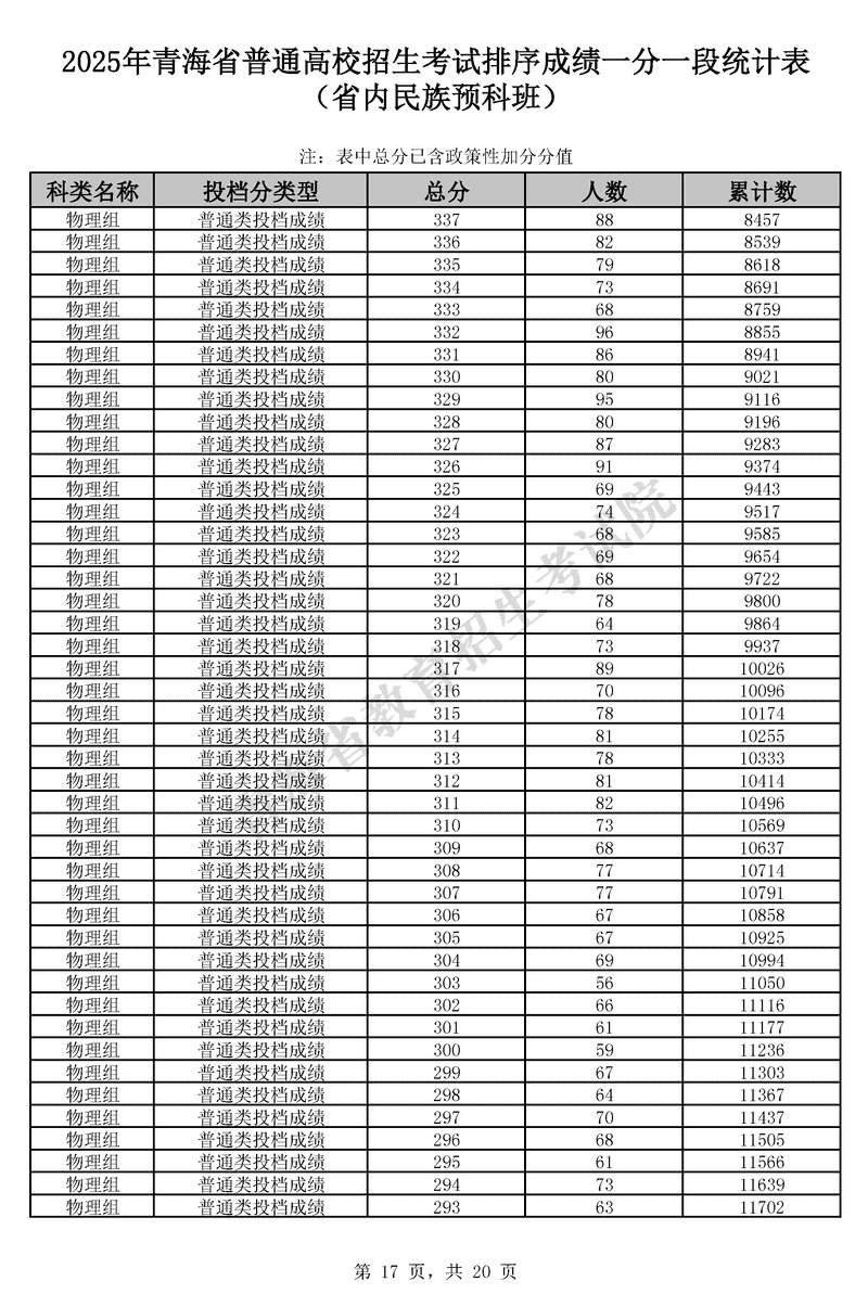 2025年青海高考排序成绩一分一段统计表(省内民族预科班)