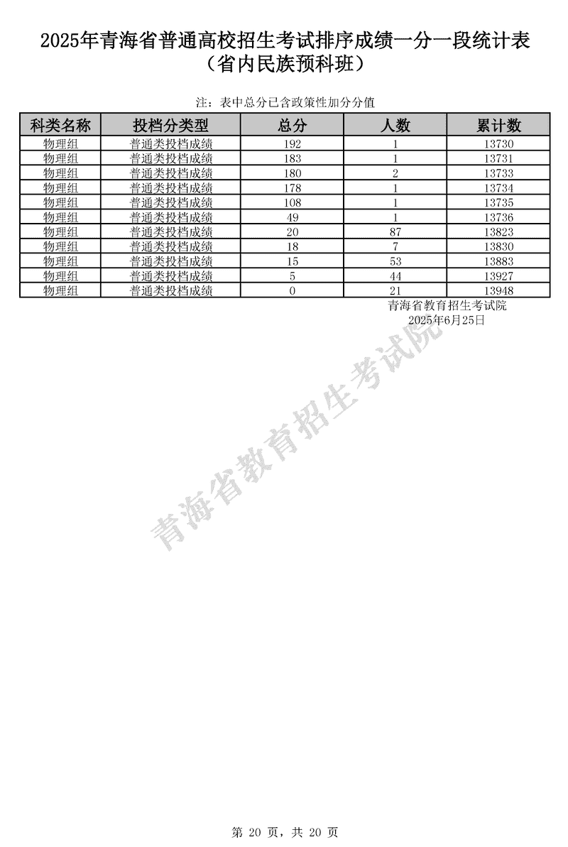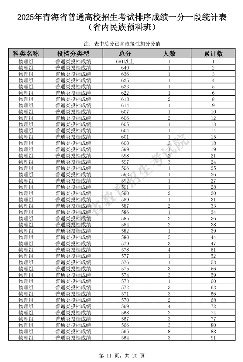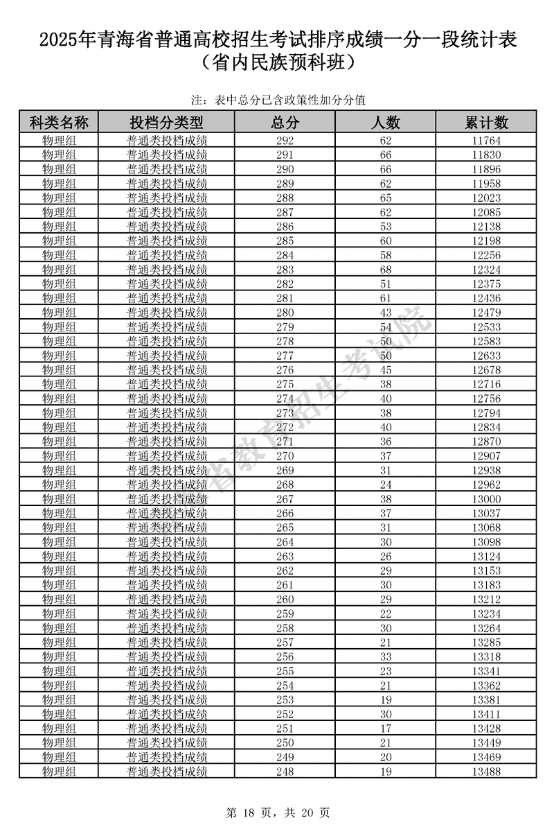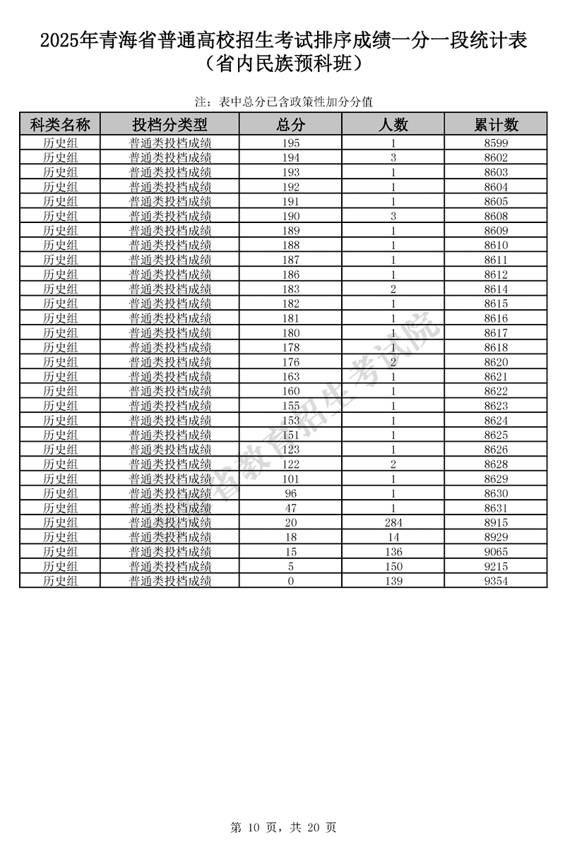 2025年青海高考排序成绩一分一段统计表(省内民族预科班)