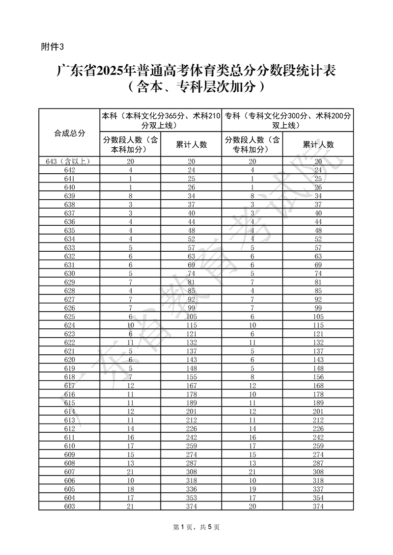 广东省2025年普通高考体育类总分一分一段统计表(含本、专科层次加分)