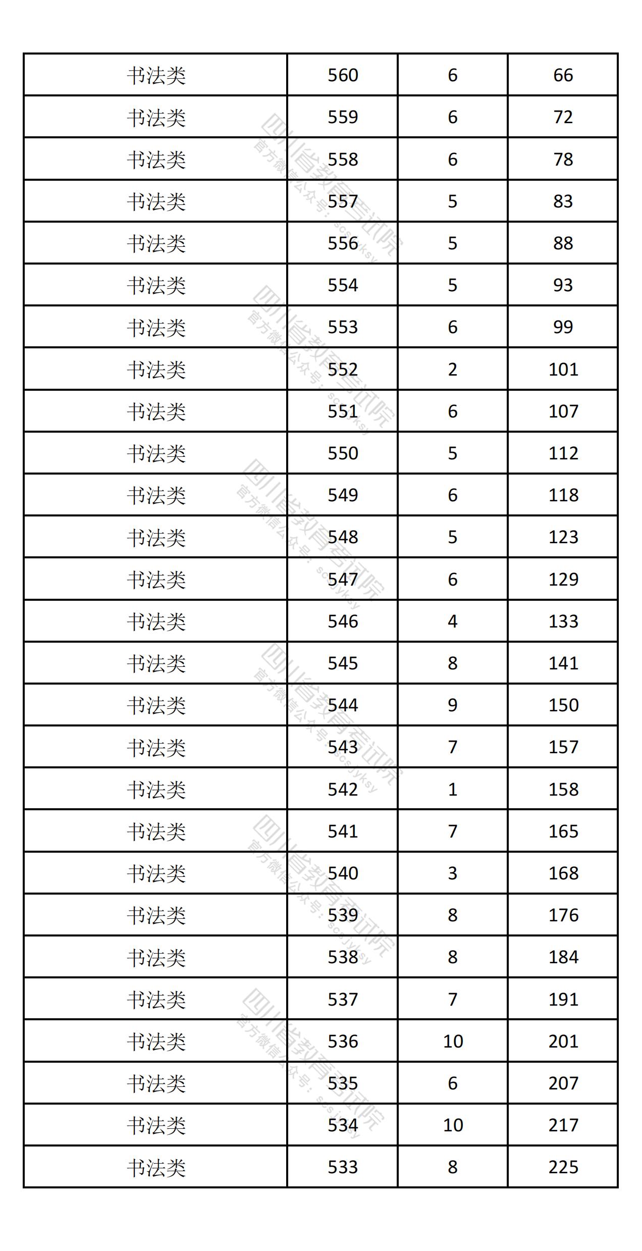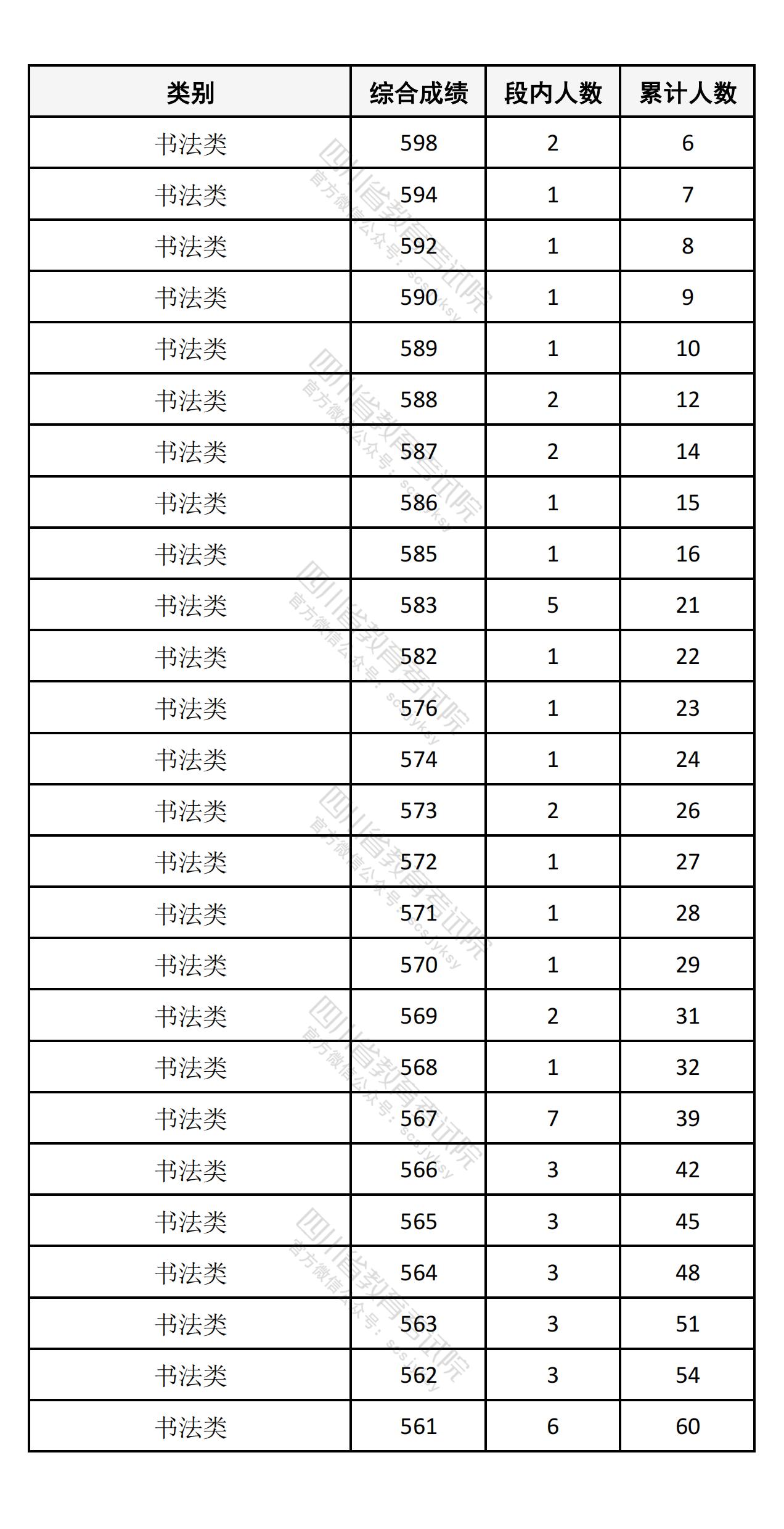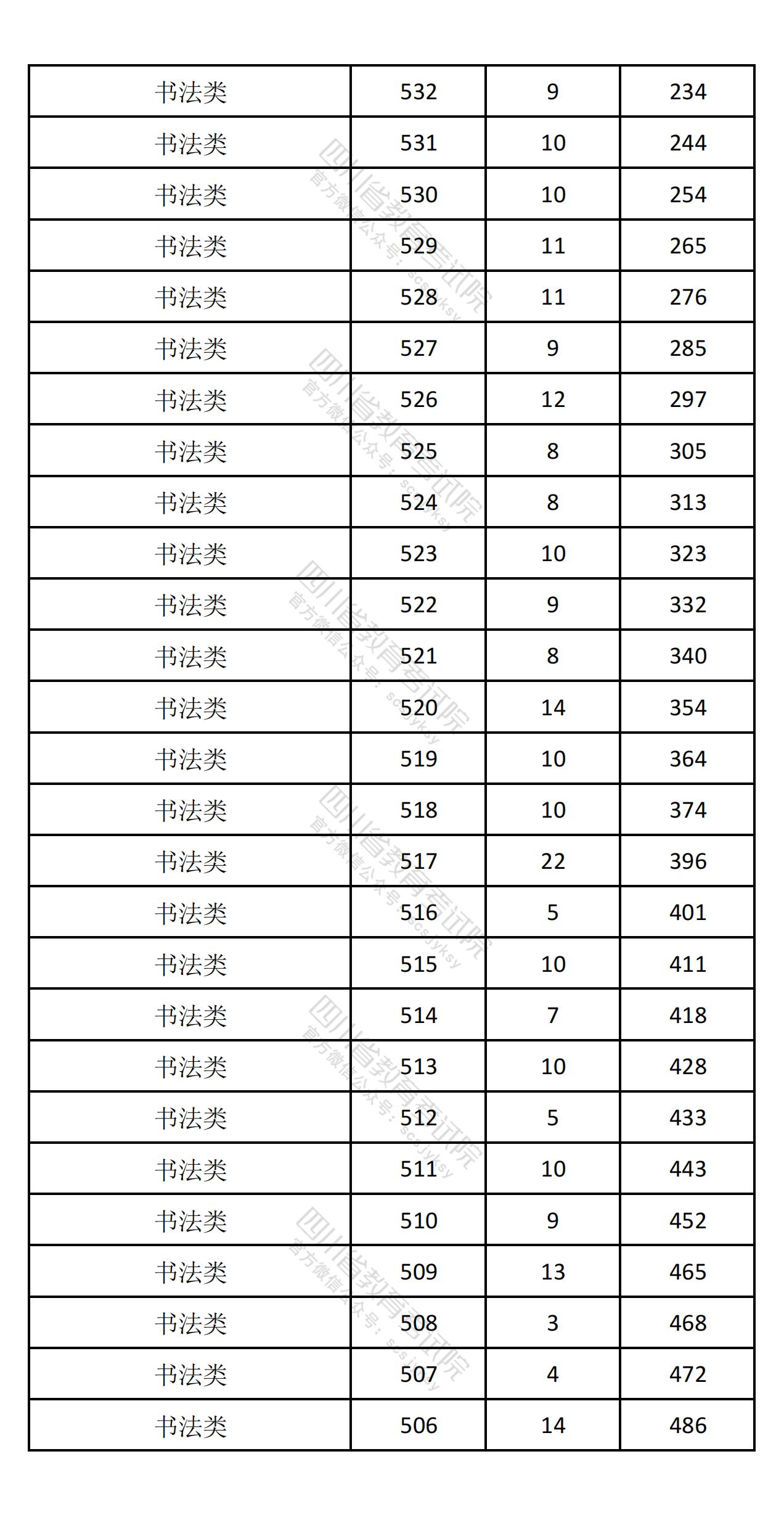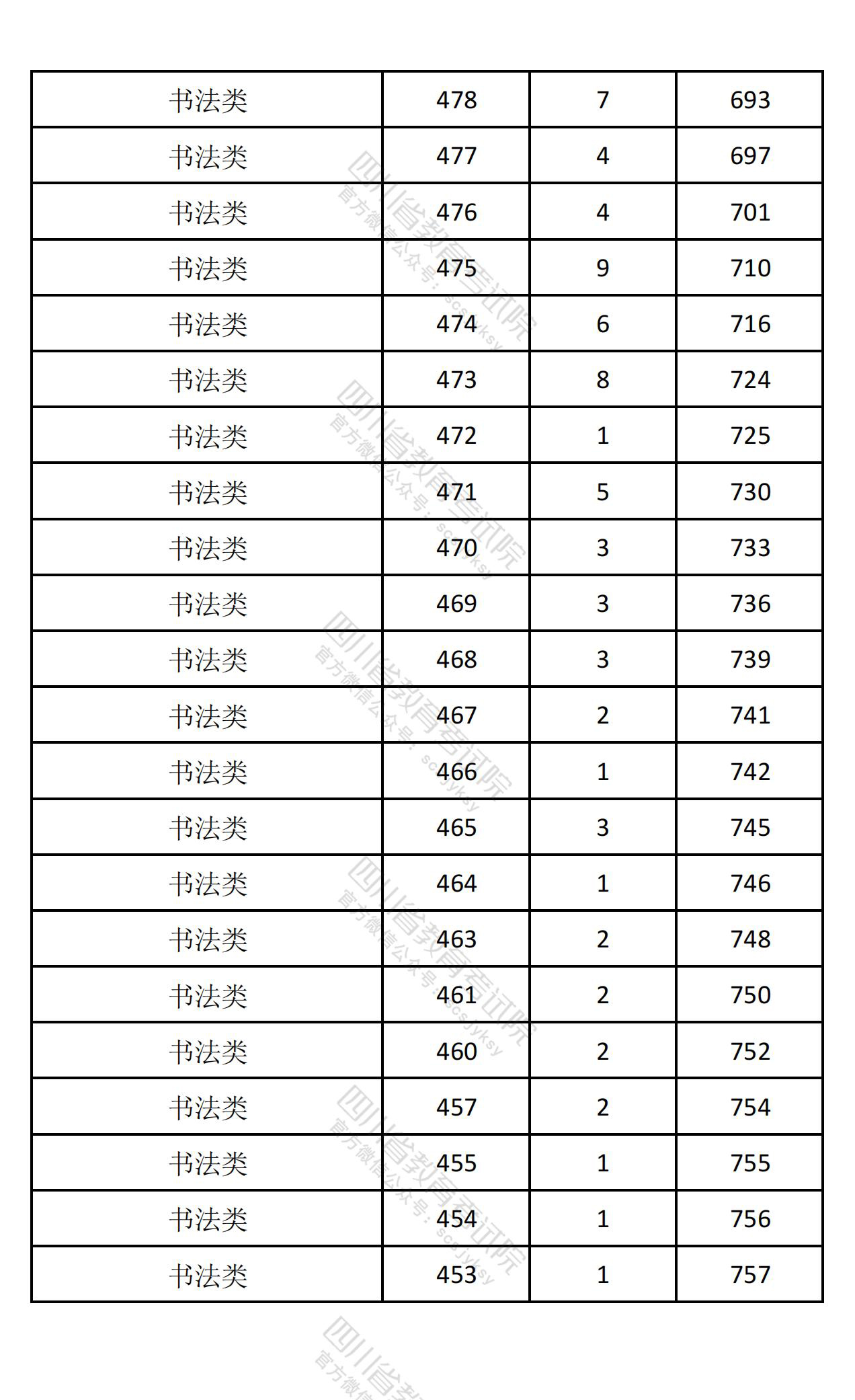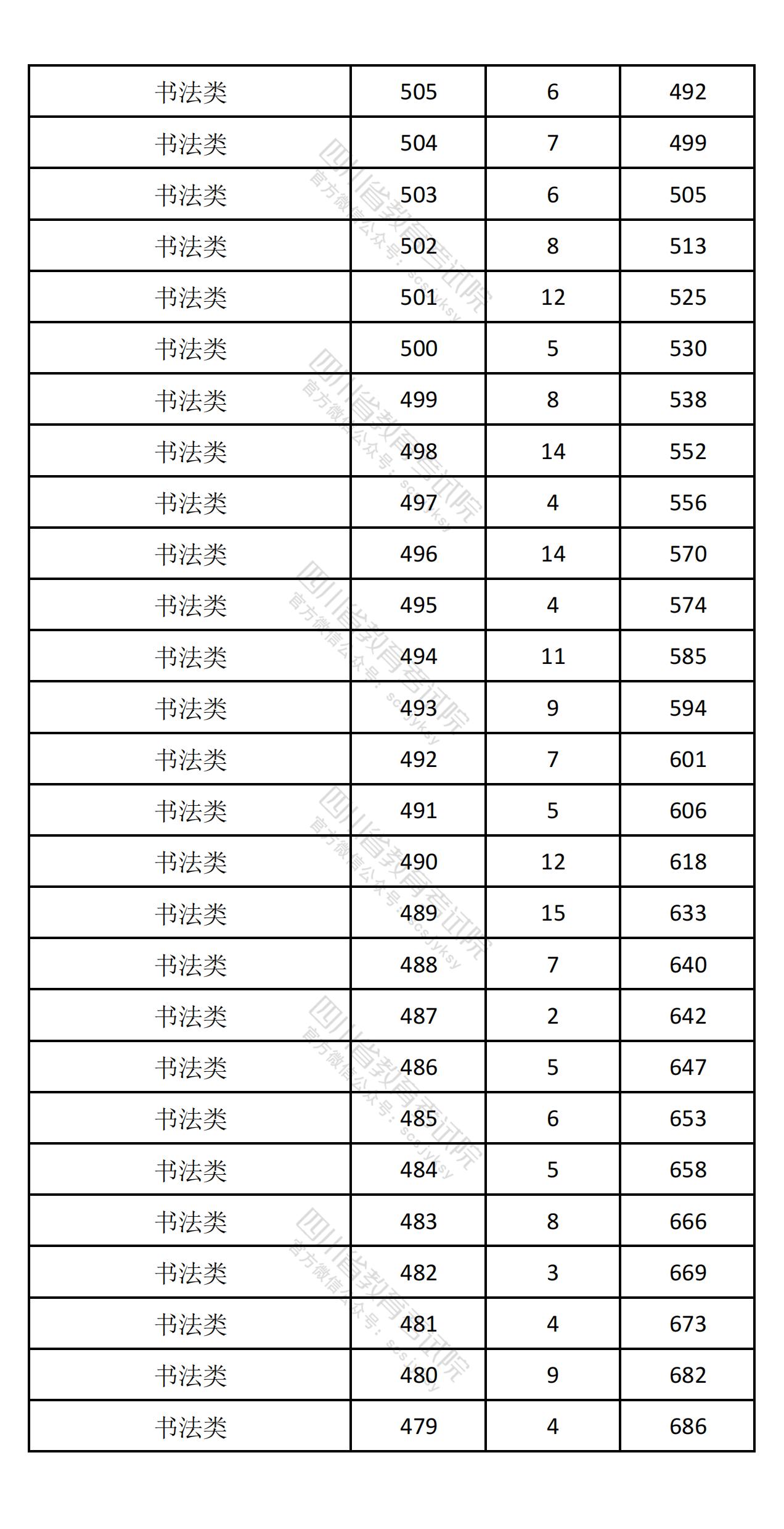 四川省2025年高考书法类综合成绩一分一段排名统计表