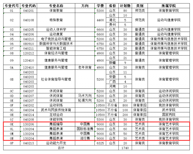 2025年山东体育学院本科各专业计划一览表-艺术类