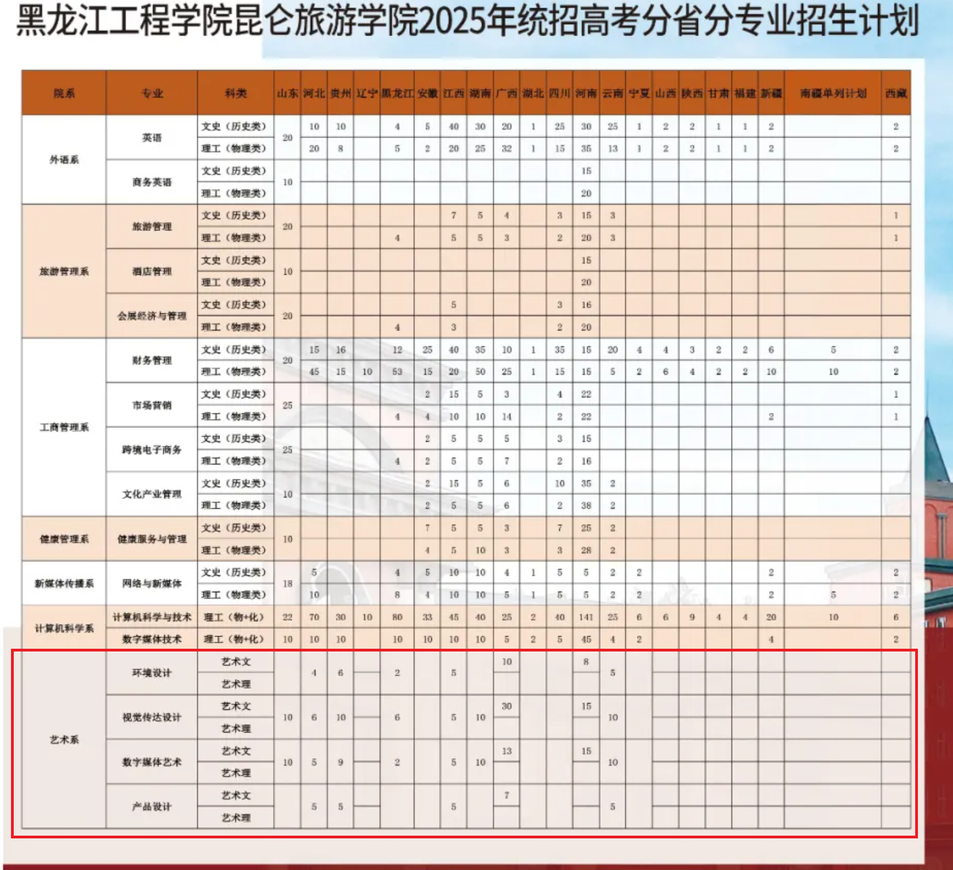 2025黑龙江工程学院昆仑旅游学院艺术类招生计划及各专业招生人数