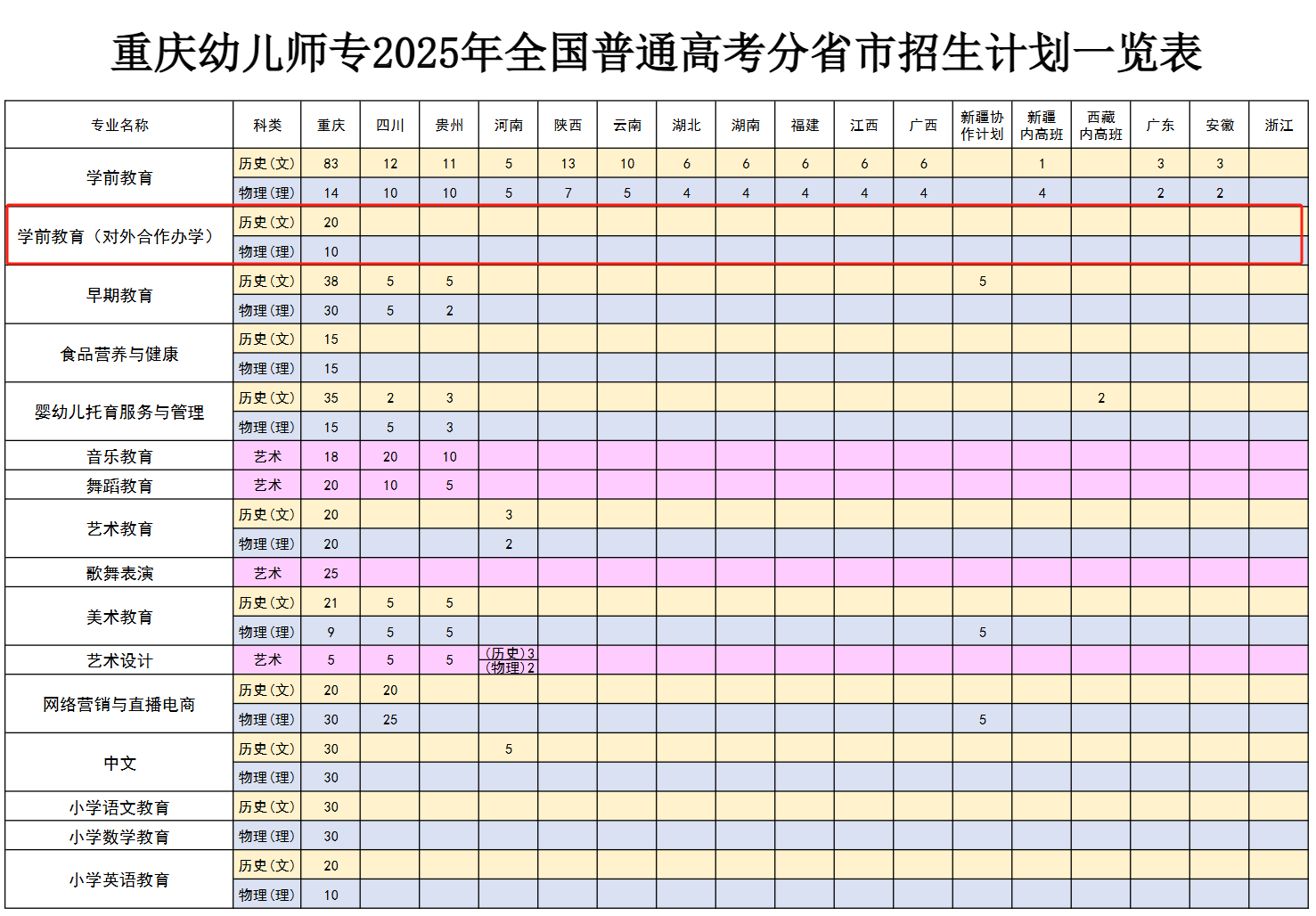 本文为大家整理的是重庆幼儿师范高等专科学校2025年中外合作办学招生计划,主要包含招生专业、各专业招生人数等信息,希望对大家有所帮助,如有变动或异议,请以各省教育考试院和学校公布的信息为准。
