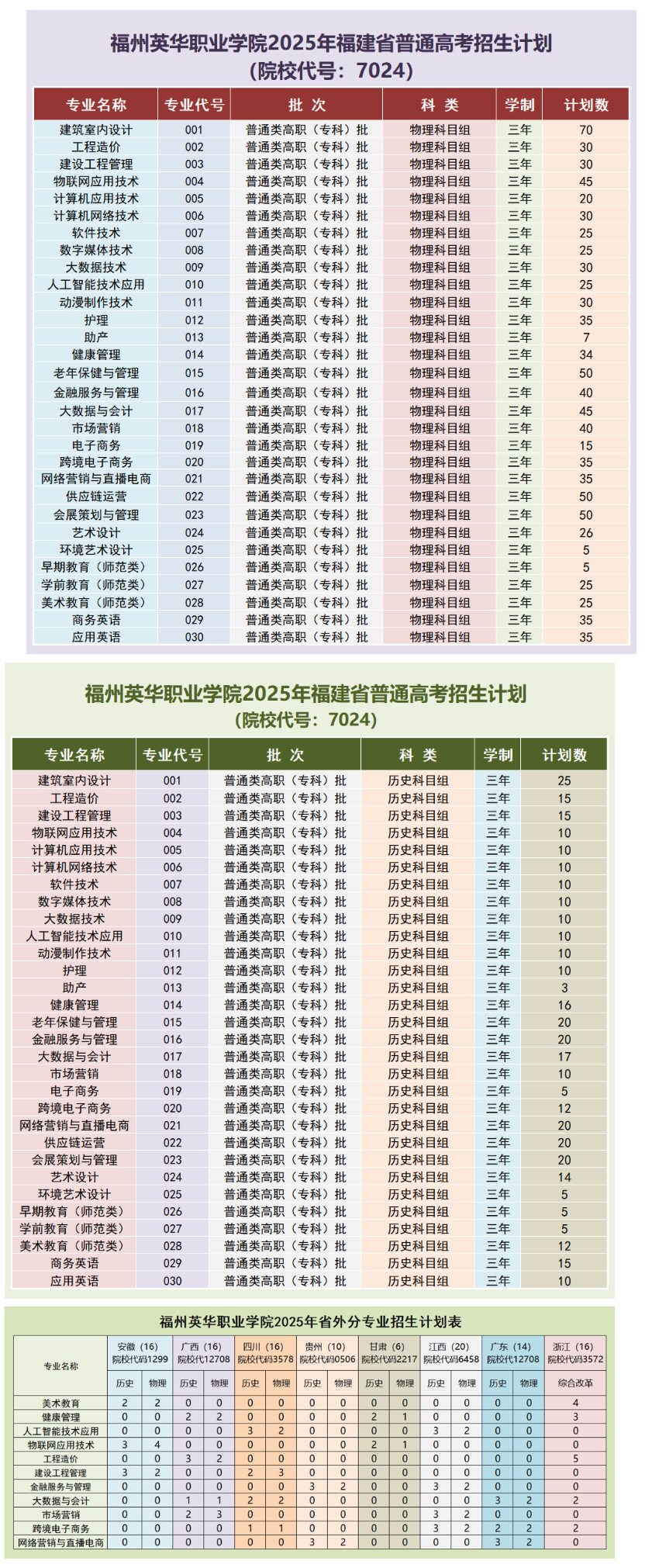 本文为大家整理的是福州英华职业学院2025年招生计划,主要包含招生专业、招生类别、各专业招生人数等信息,希望对大家有所帮助,如有变动或异议,请以各省市教育考试院或学校公布的信息为准。