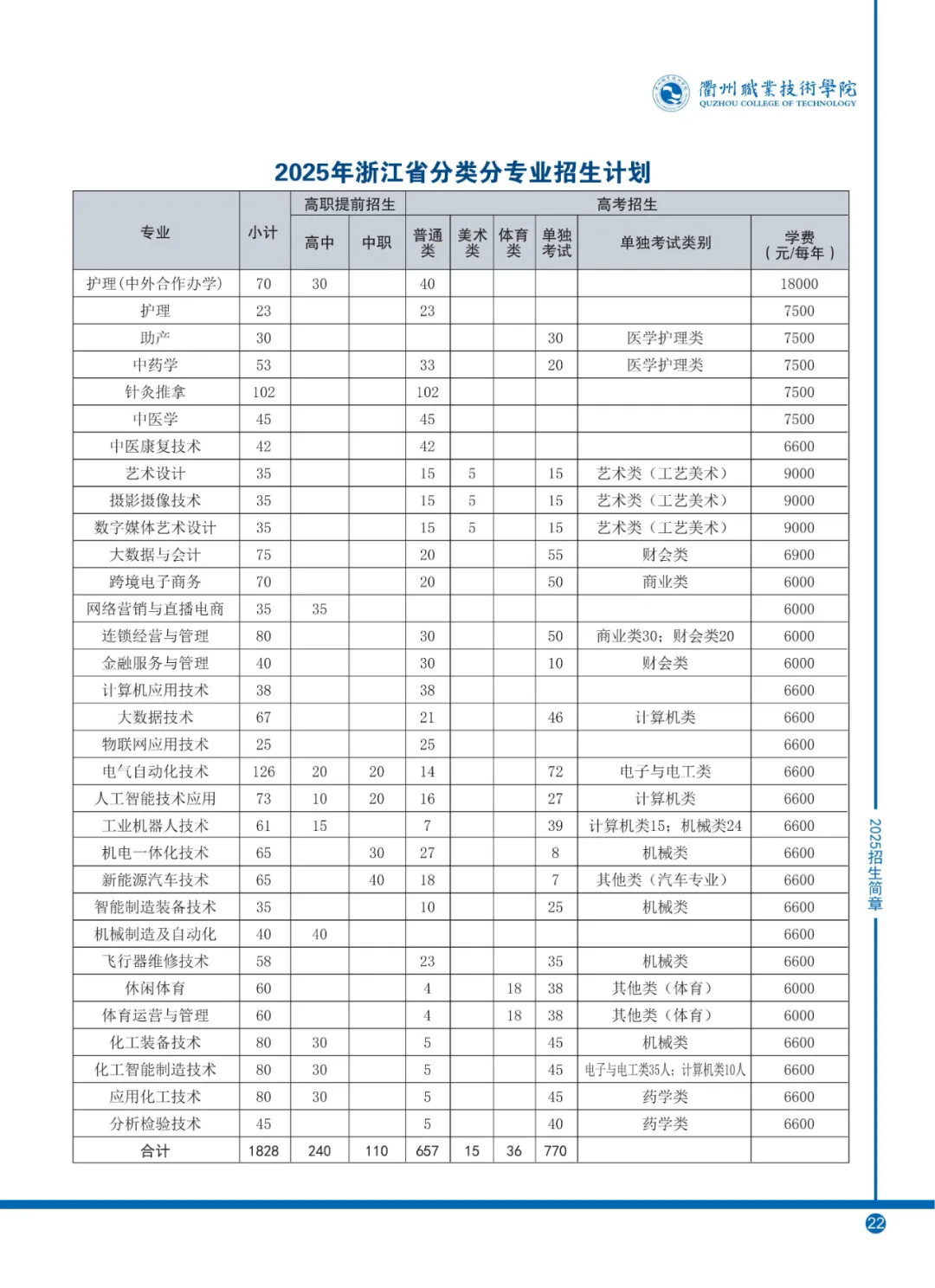 本文为大家整理的是衢州职业技术学院2025年招生计划,主要包含招生专业、招生类别、各专业招生人数等信息,希望对大家有所帮助,如有变动或异议,请以各省市教育考试院或学校公布的信息为准。