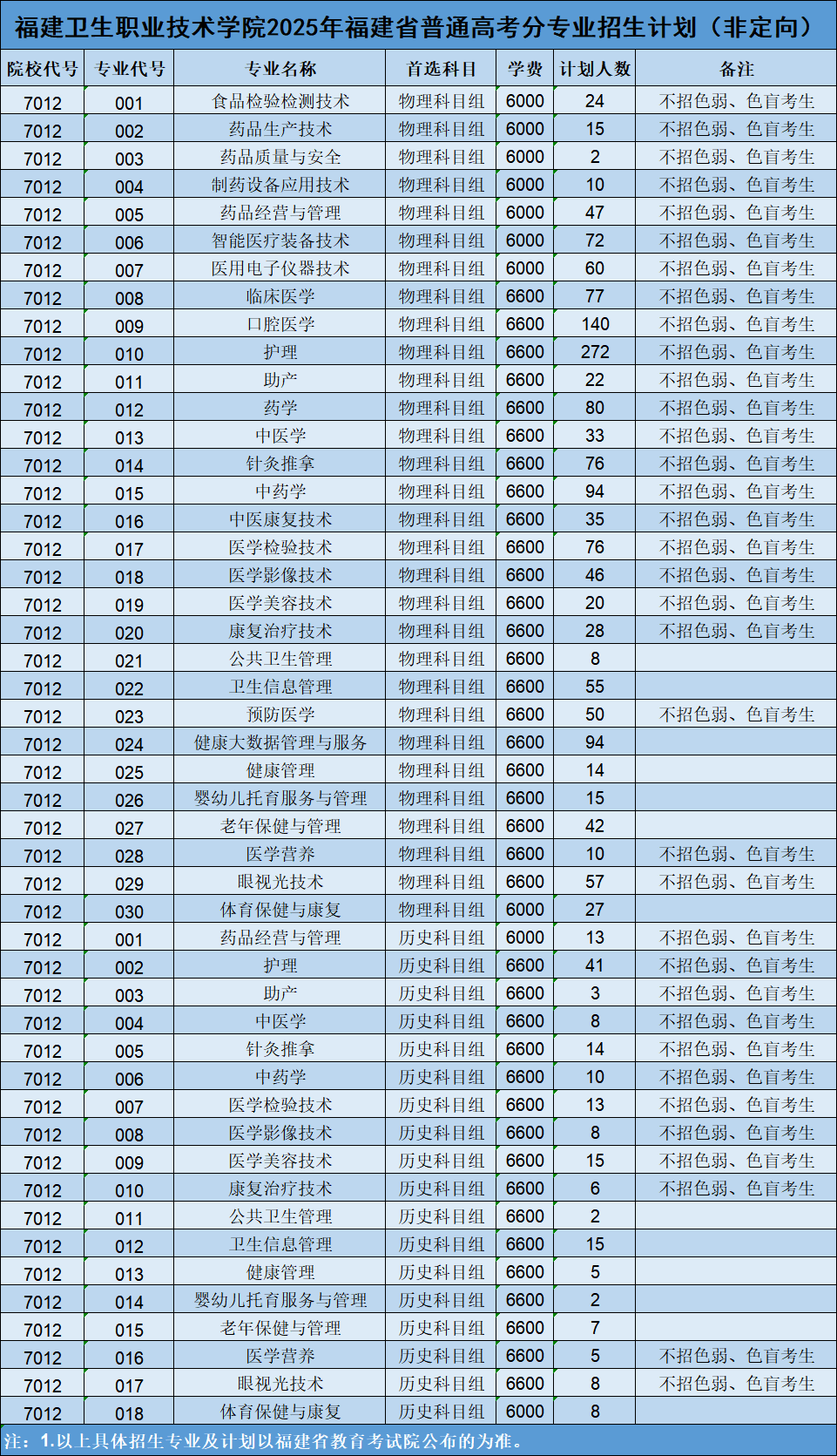 福建卫生职业技术学院2025年省外普通高考分省分专业招生计划
