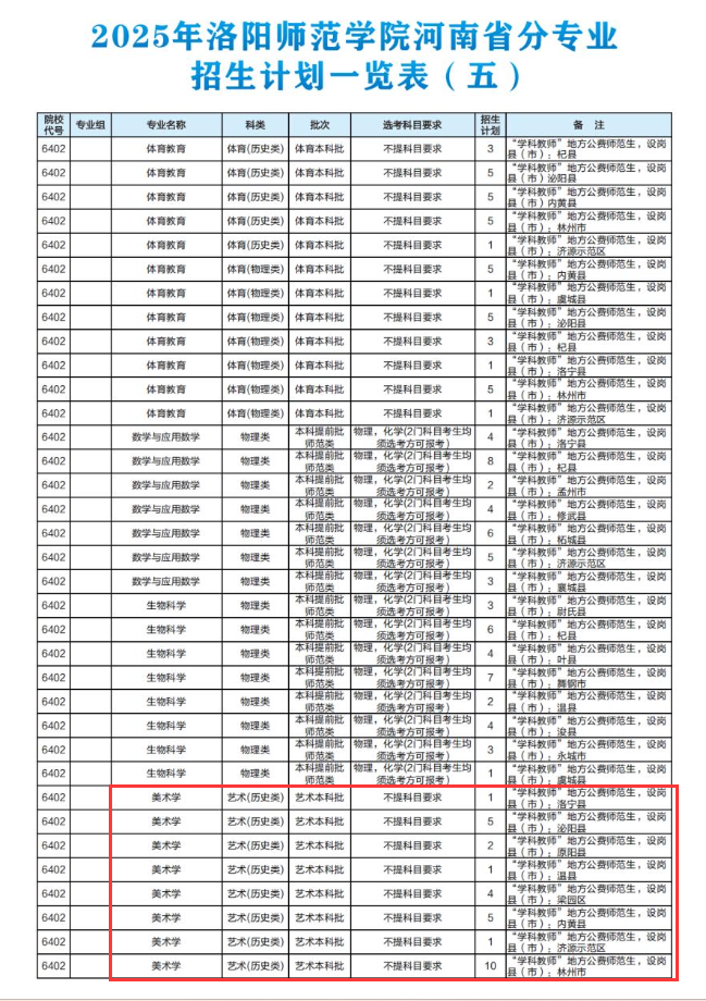 本文为大家整理的是洛阳师范学院2025年艺术类招生计划,主要包含招生专业、各专业招生人数等信息,希望对大家有所帮助,如有变动或异议,请以各省市教育考试院或学校公布的信息为准。