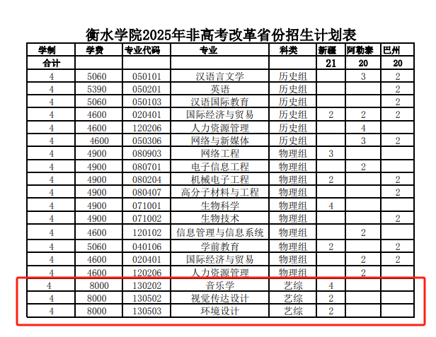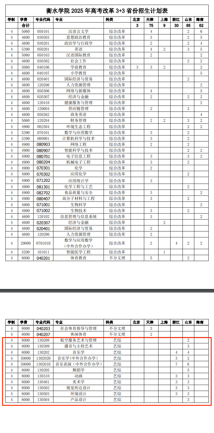 衡水学院2025年高考改革3+1+2省份招生计划表-艺术类