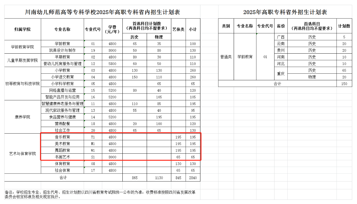 2025川南幼儿师范高等专科学校艺术类招生计划及各专业招生人数
