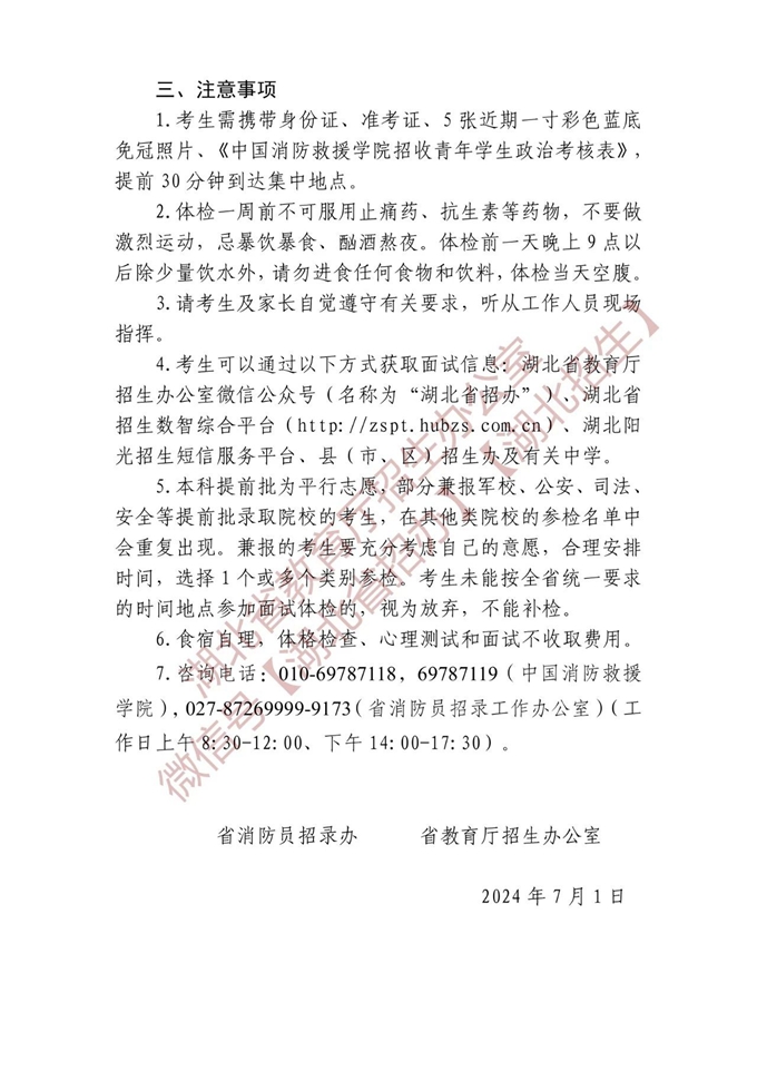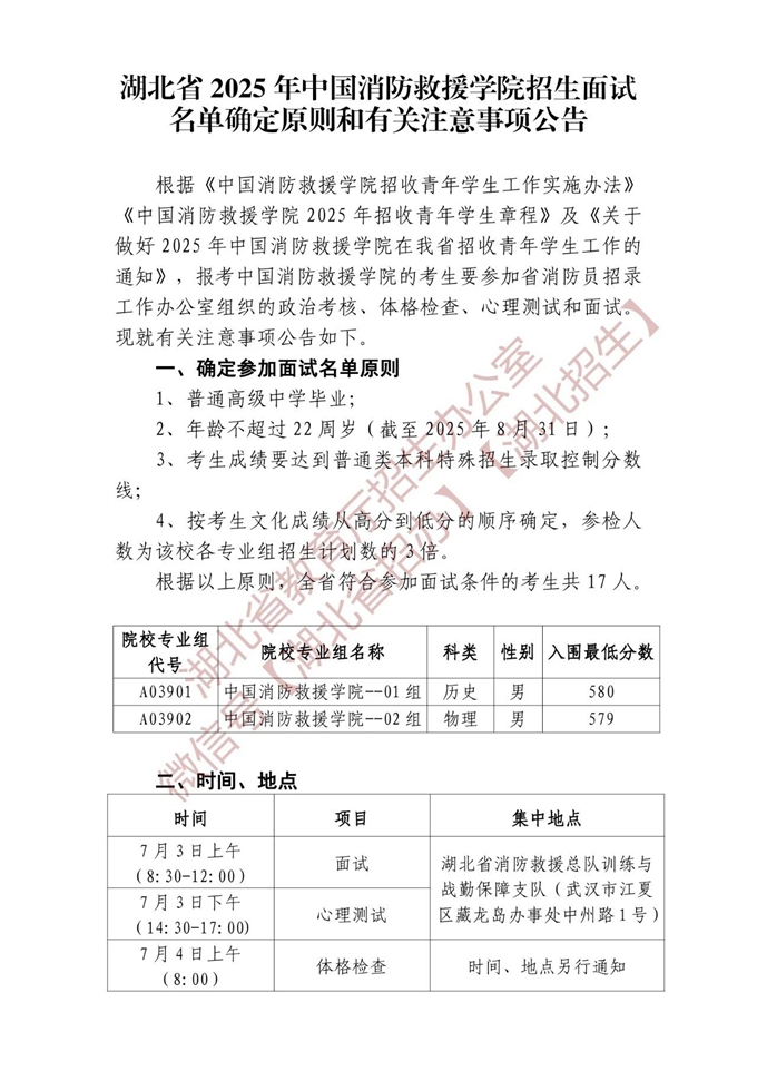 湖北省2025年中国消防救援学院招生面试名单确定原则和有关注意事项公告