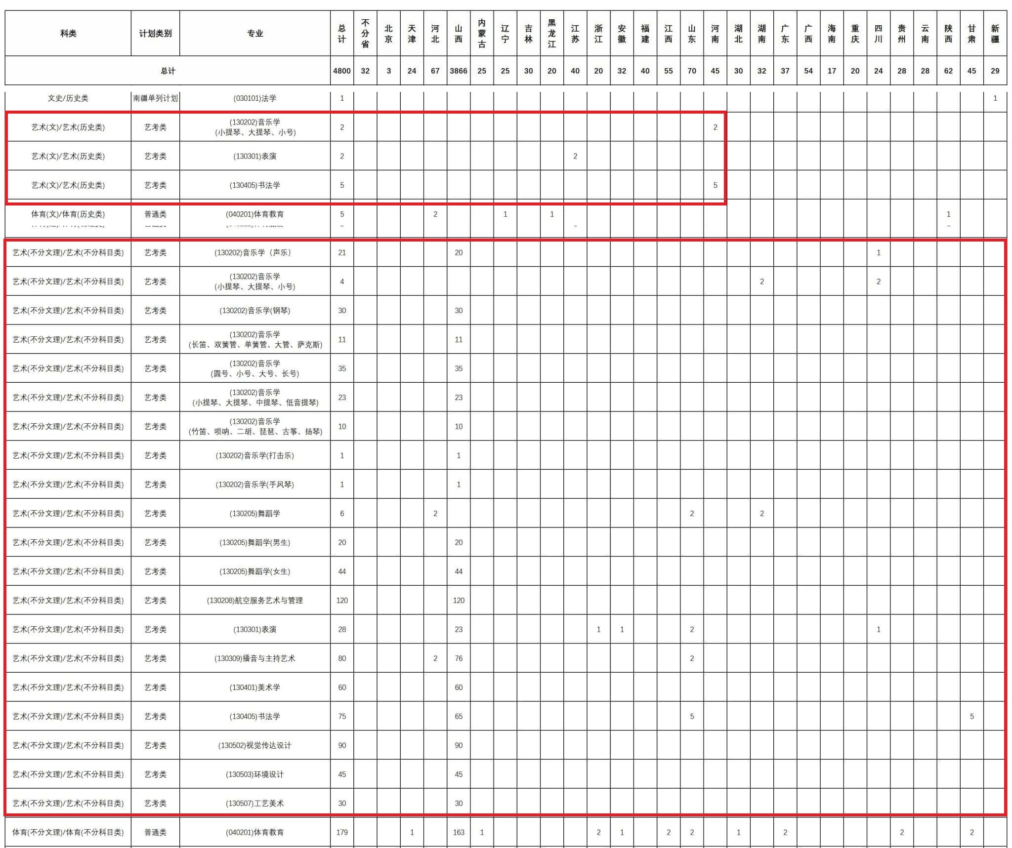山西师范大学2025年本科招生来源计划(艺术类)