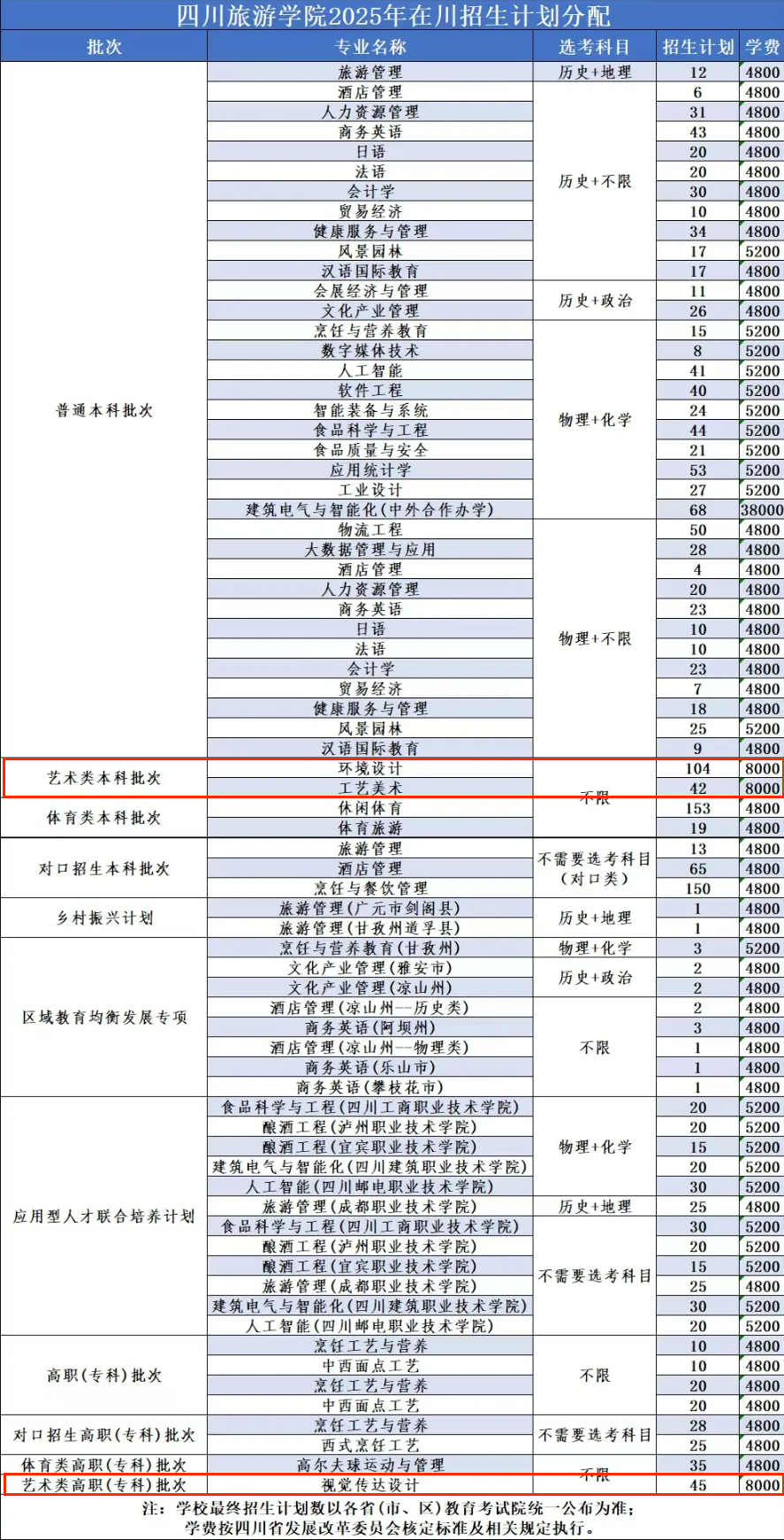 2025四川旅游学院艺术类招生计划及各专业招生人数