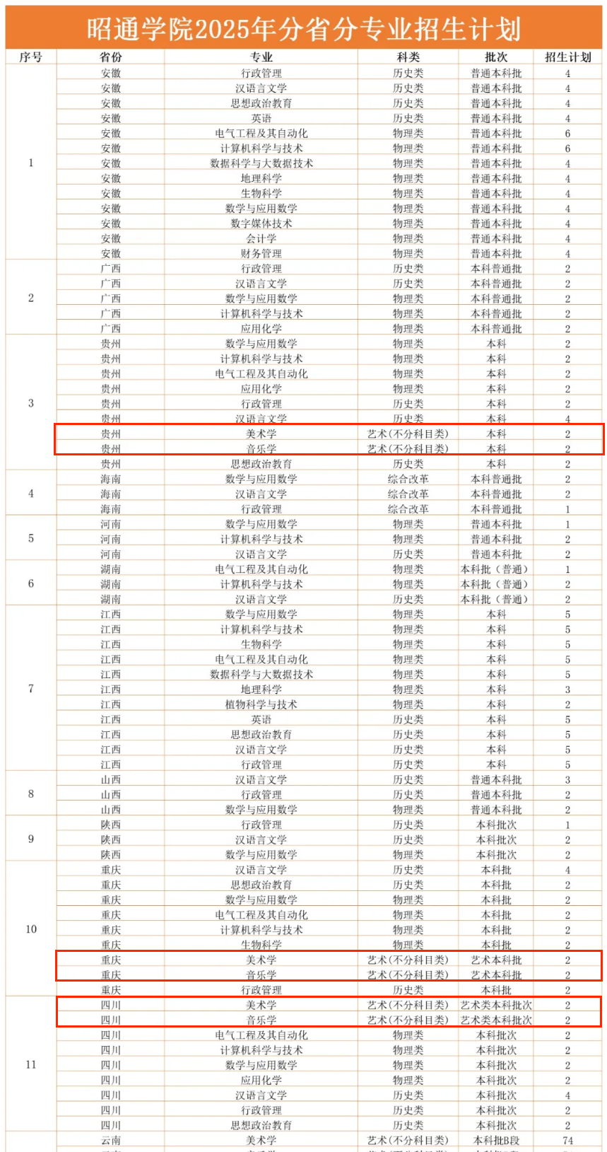 本文为大家整理的是昭通学院2025年艺术类招生计划,主要包含招生专业、各专业招生人数等信息,希望对大家有所帮助,如有变动或异议,请以各省市教育考试院或学校公布的信息为准。