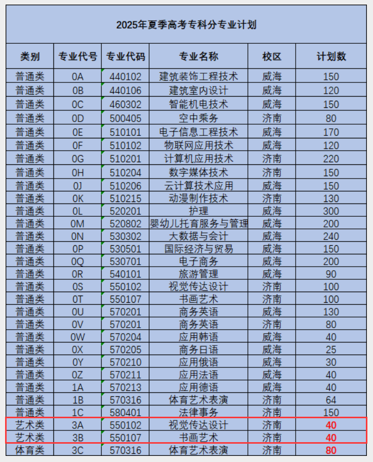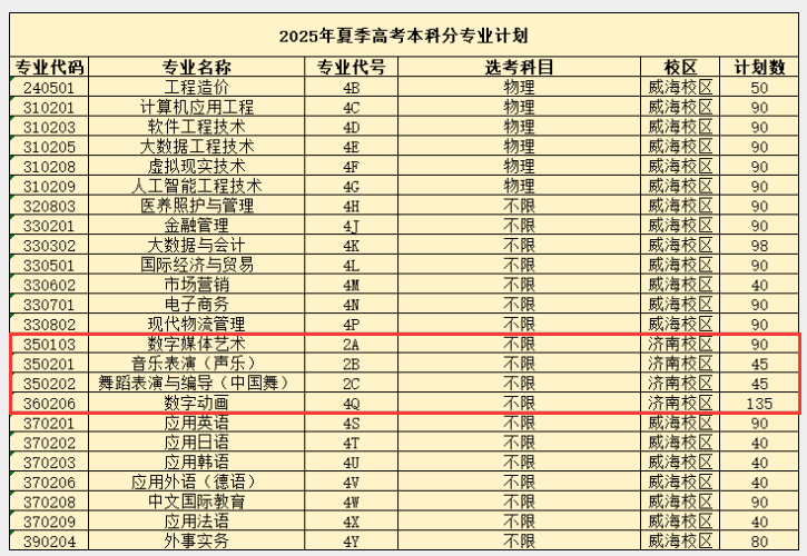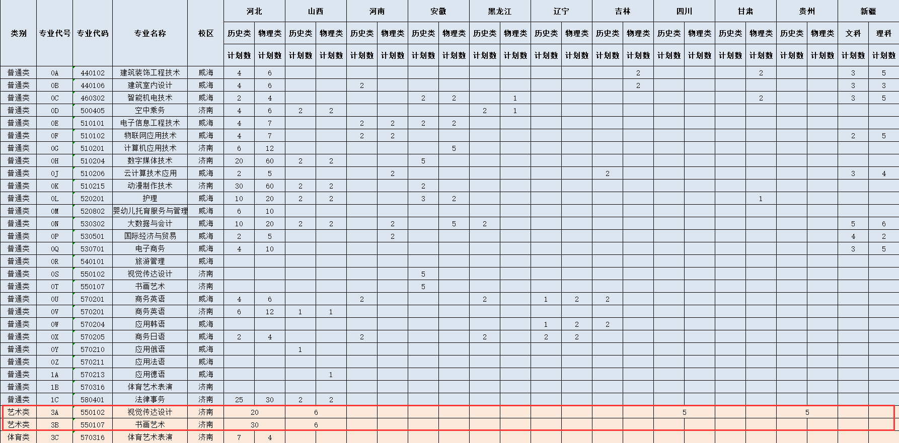 2025年山东外事职业大学本科专科分专业计划表(省内)-艺术类