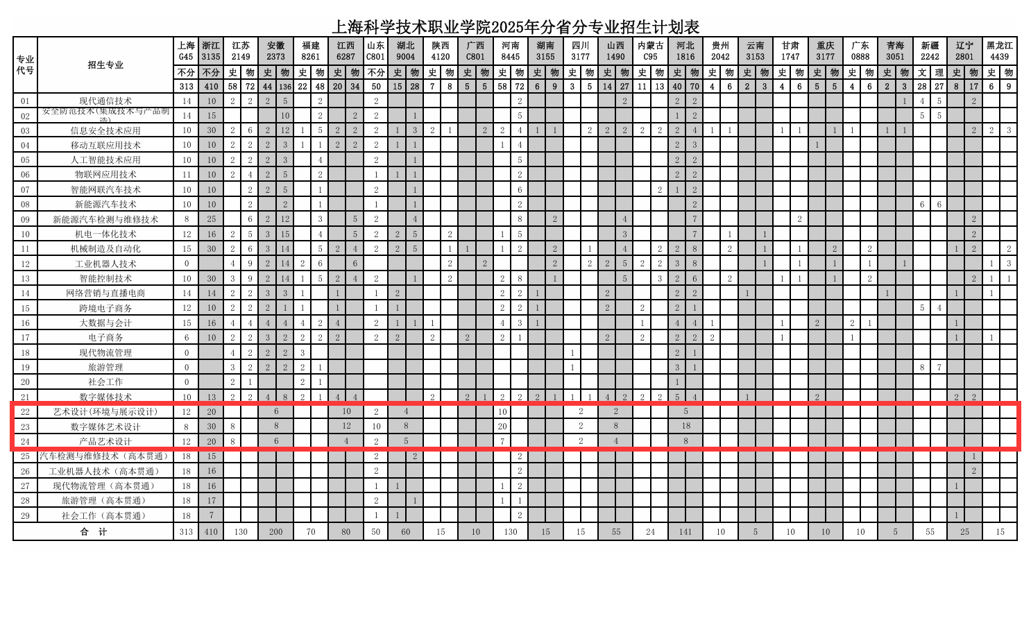 本文为大家整理的是上海科学技术职业学院2025年艺术类招生计划,主要包含招生专业、各专业招生人数等信息,希望对大家有所帮助,如有变动或异议,请以各省市教育考试院或学校公布的信息为准。