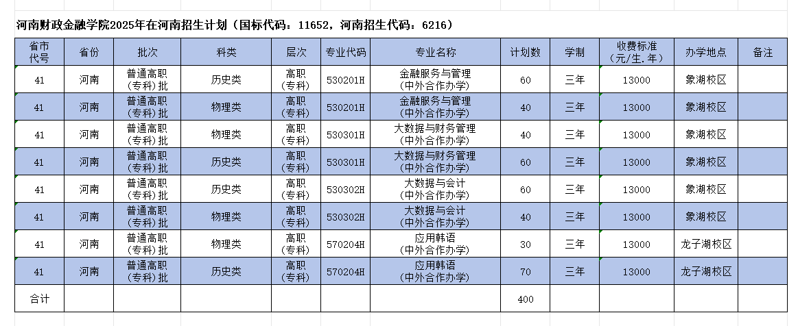 2025河南财政金融学院中外合作办学招生计划及各专业招生人数