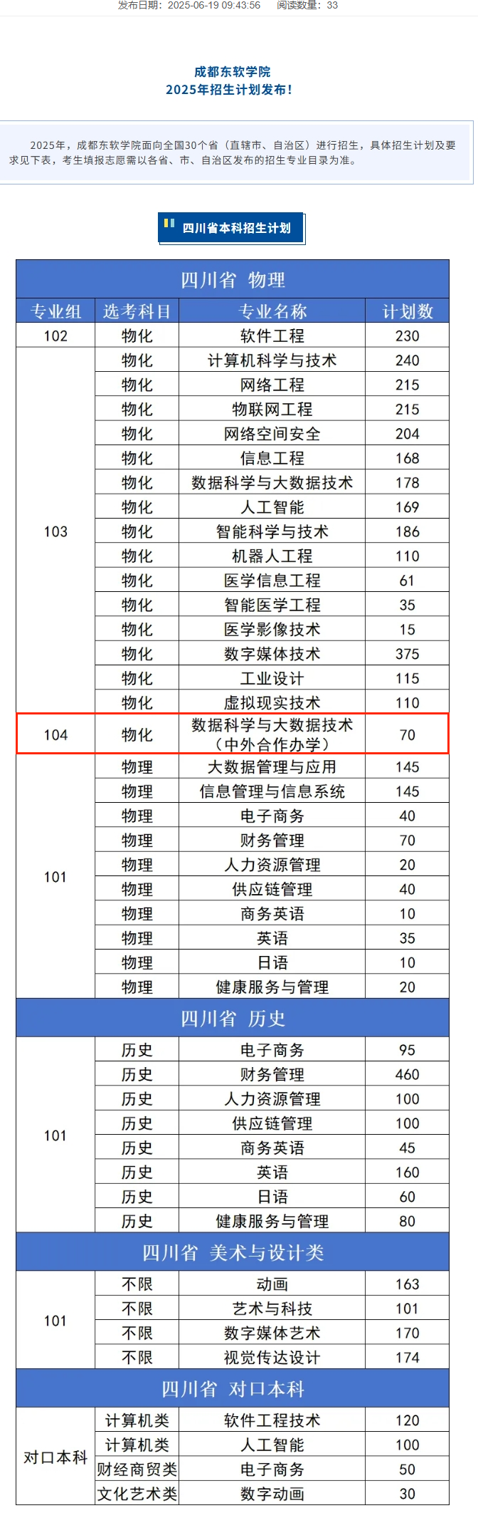 本文为大家整理的是成都东软学院2025年中外合作办学招生计划,主要包含招生专业、各专业招生人数等信息,希望对大家有所帮助,如有变动或异议,请以各省教育考试院和学校公布的信息为准。