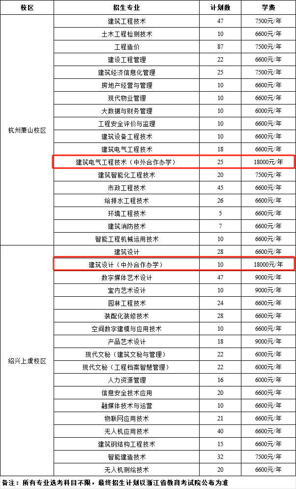 2025浙江建设职业技术学院中外合作办学招生计划及各专业招生人数