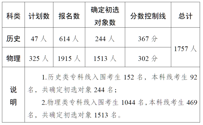 6月25日至30日,全区2866名考生填报定向培养军士志愿,符合招收条件2529人,按照本科线报名考生直接确定为体格检查和政治考核初选对象,专科线考生以考分从高到低的顺序,按招收计划数3.2倍比例划定入围分数线,共确定初选对象1757人,具体公布如下: