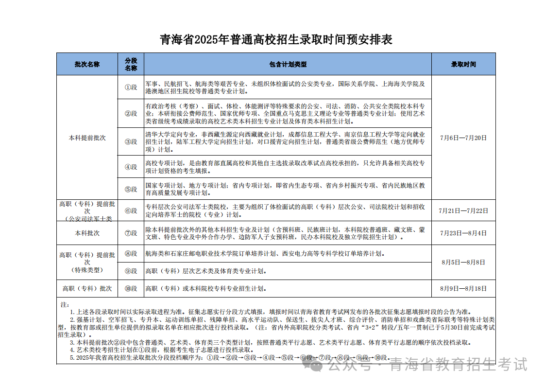 青海省2025年普通高校招生录取时间预安排 时间:2025-07-07 青海 高考新闻 2025年我省普通高校招生录取共设置四个批次,依次为:本科提前批次、本科批、高职(专科)提前批次、高职(专科)批次,各批次设置不同的段,分别投档录取。根据工作安排,现将录取日程安排公布如下: