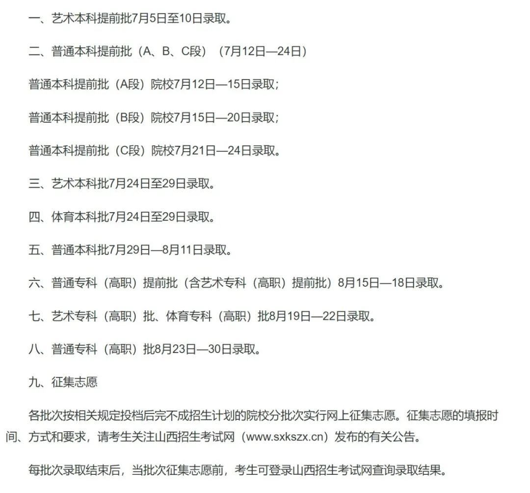 2025年山西高考各批次录取时间安排如下:
