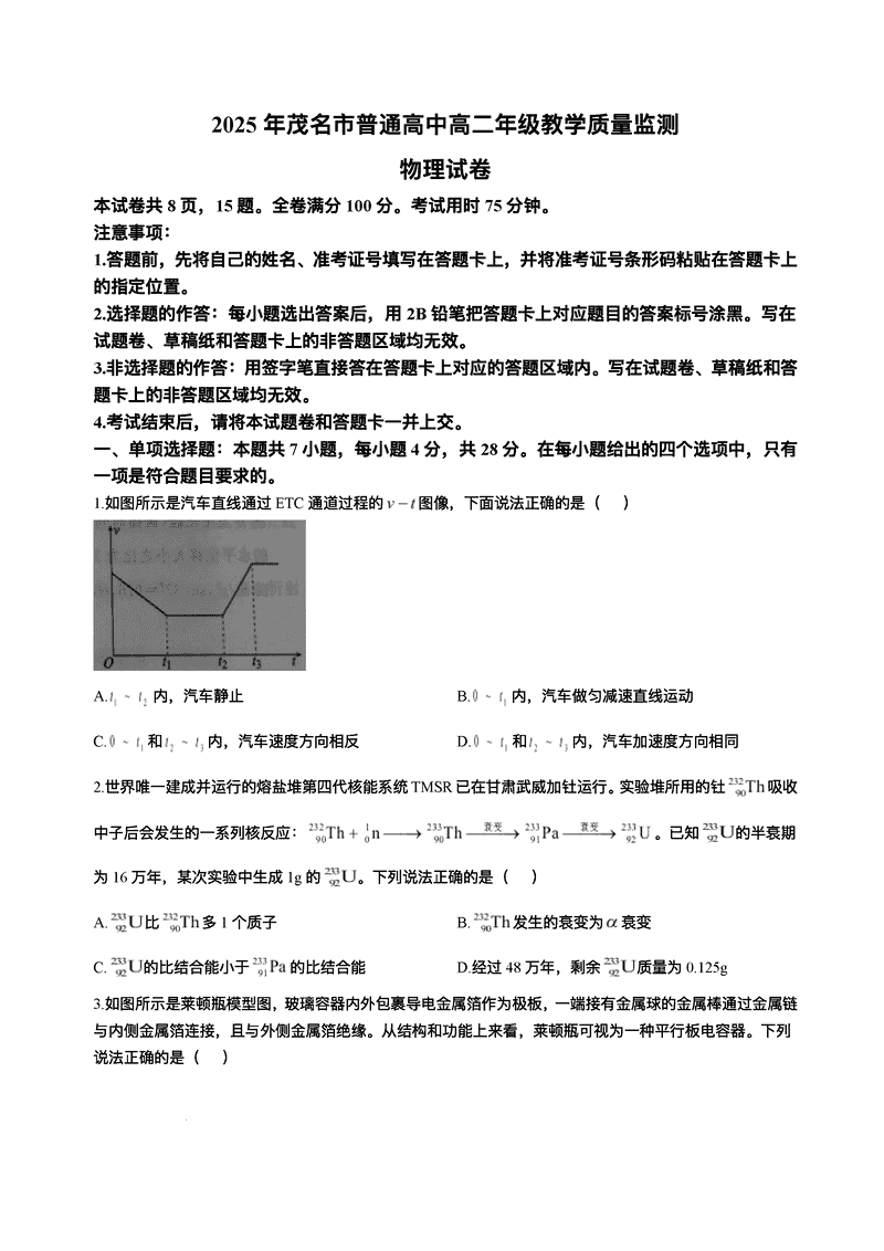 广东茂名2025年高二下学期期末教学质量监测物理试题及答案 时间:2025-07-08 广东 高中物理 广东省茂名市2024-2025学年高二下学期期末教学质量监测物理考试已于近日开考,为方便考生考后及时查看考试情况,查漏补缺、弥补不足,本文整理了试题答案解析相关信息! 物理试题及答案解析