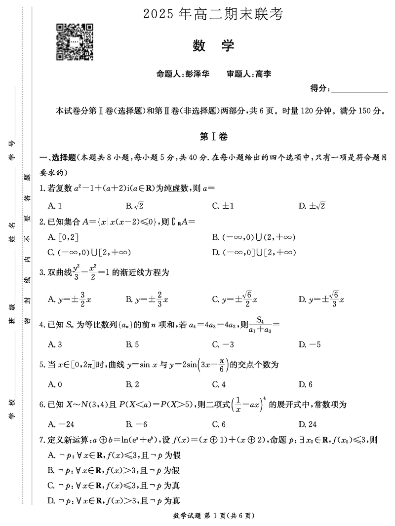 湖南新高考教学教研联盟暨长郡二十校联盟2025年高二年级下学期期末联考数学考试已于近日开考,为方便考生考后及时查看考试情况,查漏补缺、弥补不足,本文整理了试题答案解析相关信息!