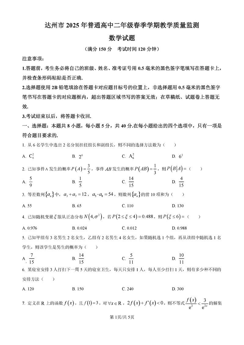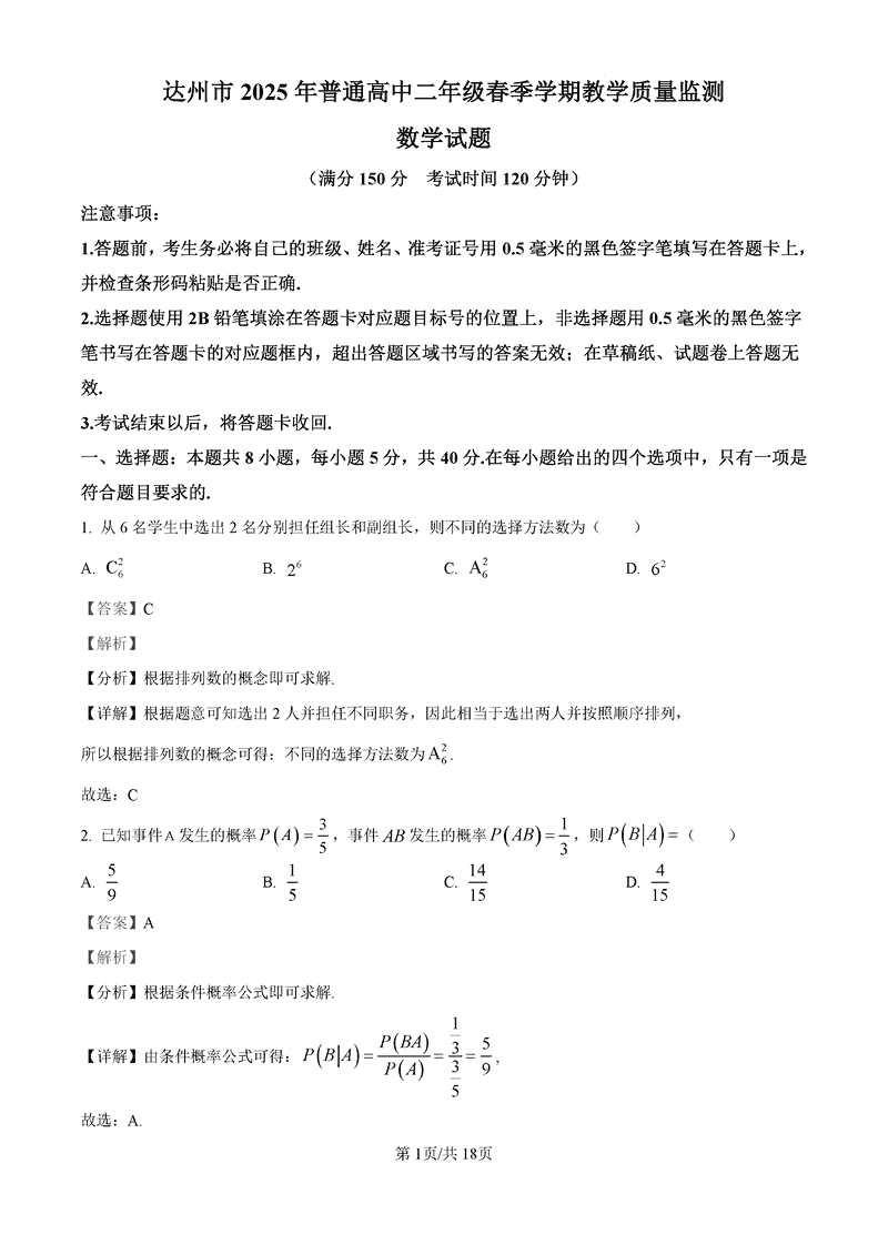 四川达州2025年高二春季教学质量监测数学试题及答案 时间:2025-07-08 四川 高中数学 四川省达州市2025年普通高二年级春季学期教学质量监测数学考试已于近日开考,为方便考生考后及时查看考试情况,查漏补缺、弥补不足,本文整理了试题答案解析相关信息! 数学试题及答案解析