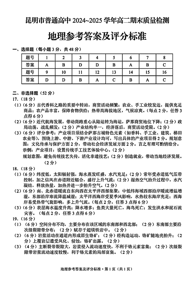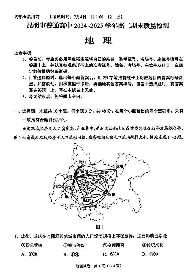 昆明市2024-2025学年高二下学期期末地理试题及答案 时间:2025-07-08 云南 高中地理 云南省昆明市2024-2025学年高二下学期期末质量监测地理考试已于近日开考,为方便考生考后及时查看考试情况,查漏补缺、弥补不足,本文整理了试题答案解析相关信息! 地理试题及答案解析