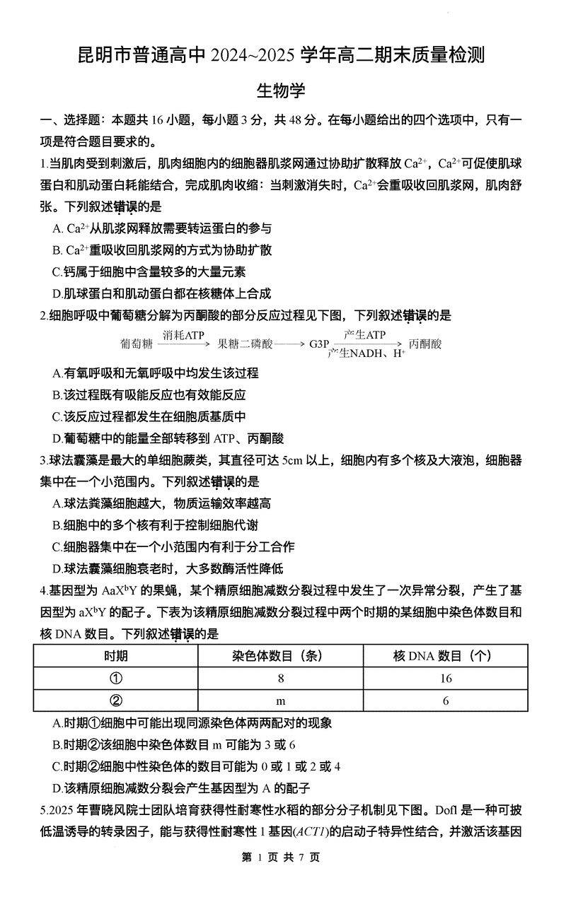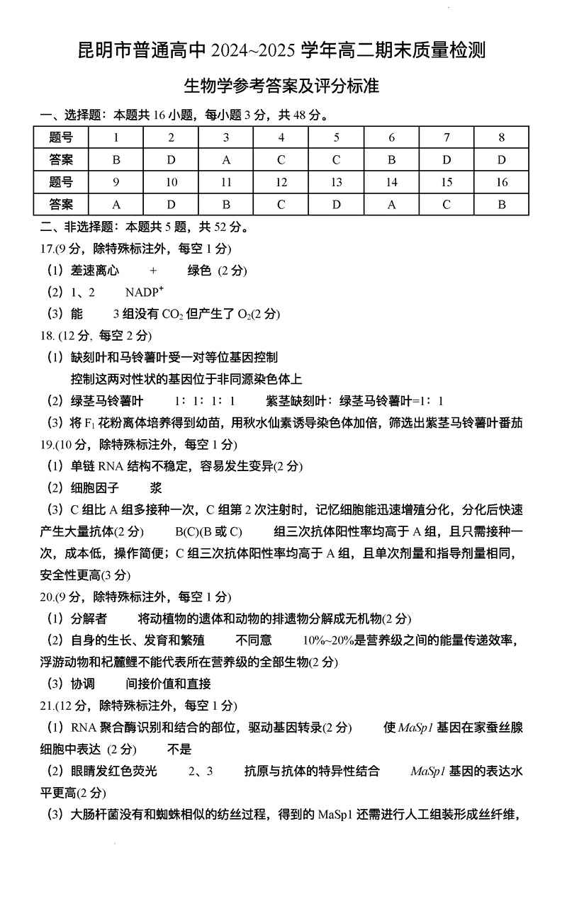 昆明市2024-2025学年高二下学期期末生物试题及答案 时间:2025-07-08 云南 高中生物 云南省昆明市2024-2025学年高二下学期期末质量监测生物考试已于近日开考,为方便考生考后及时查看考试情况,查漏补缺、弥补不足,本文整理了试题答案解析相关信息! 生物试题及答案解析