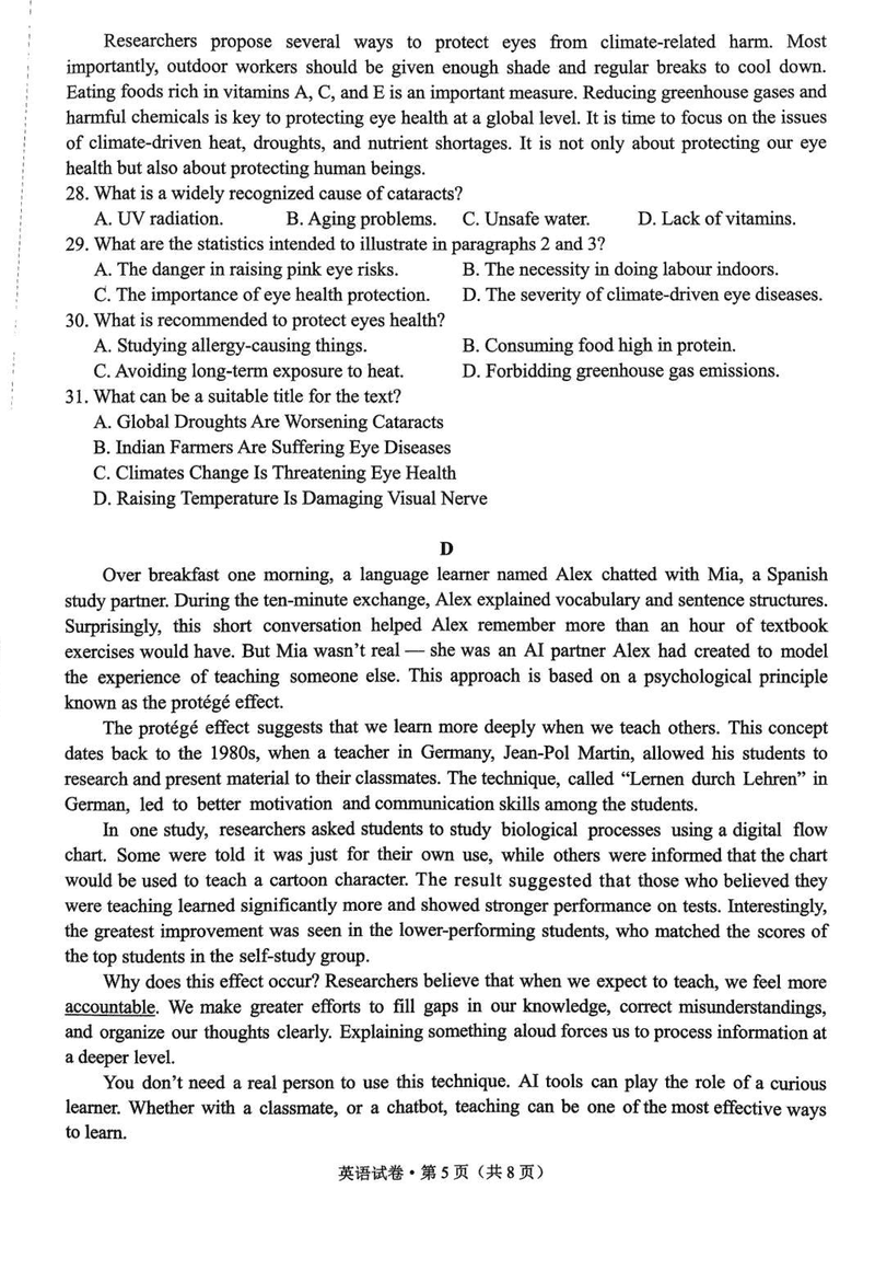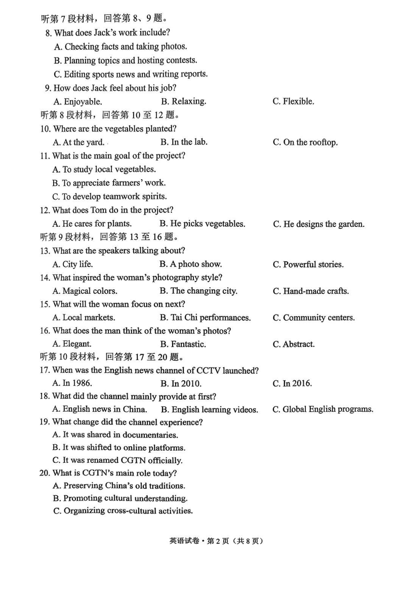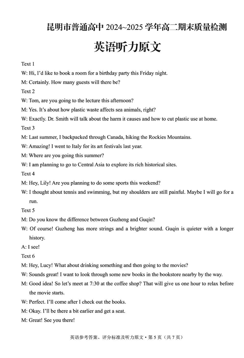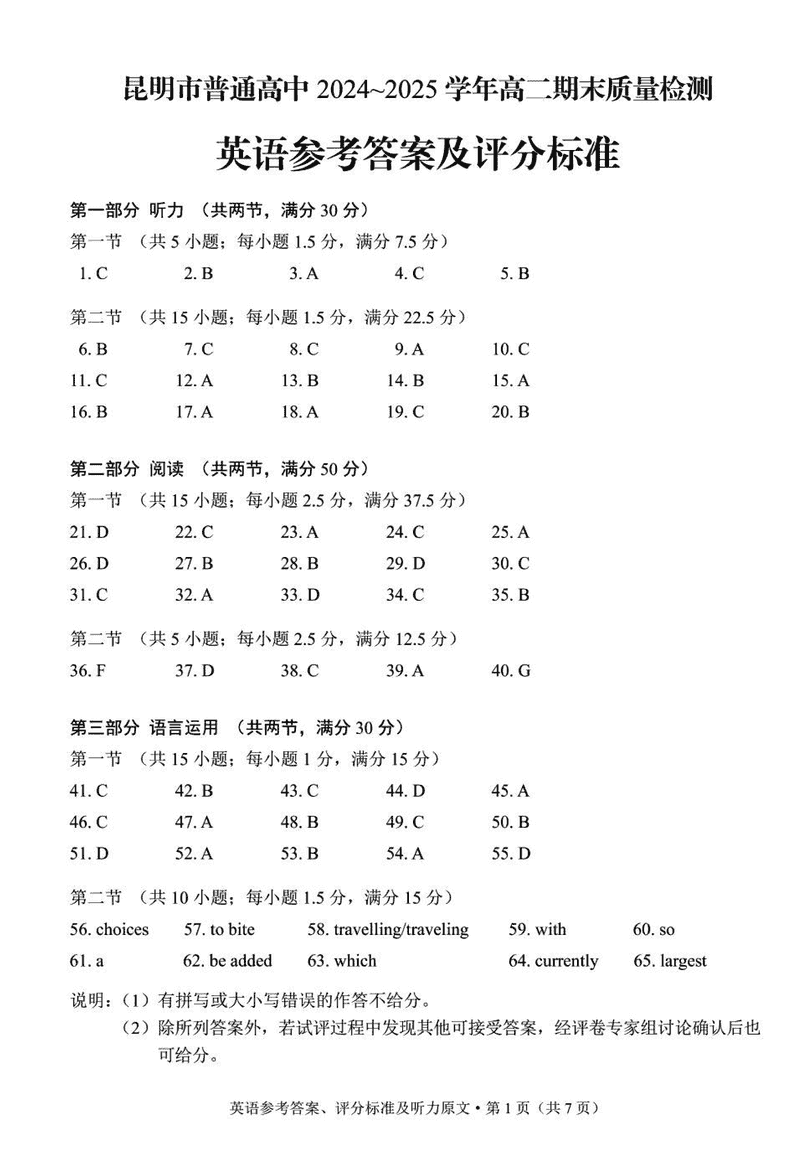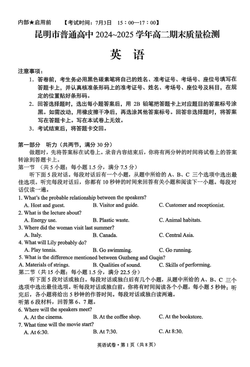 昆明市2024-2025学年高二下学期期末英语试题及答案 时间:2025-07-08 云南 高中英语 云南省昆明市2024-2025学年高二下学期期末质量监测英语考试已于近日开考,为方便考生考后及时查看考试情况,查漏补缺、弥补不足,本文整理了试题答案解析相关信息! 英语试题及答案解析