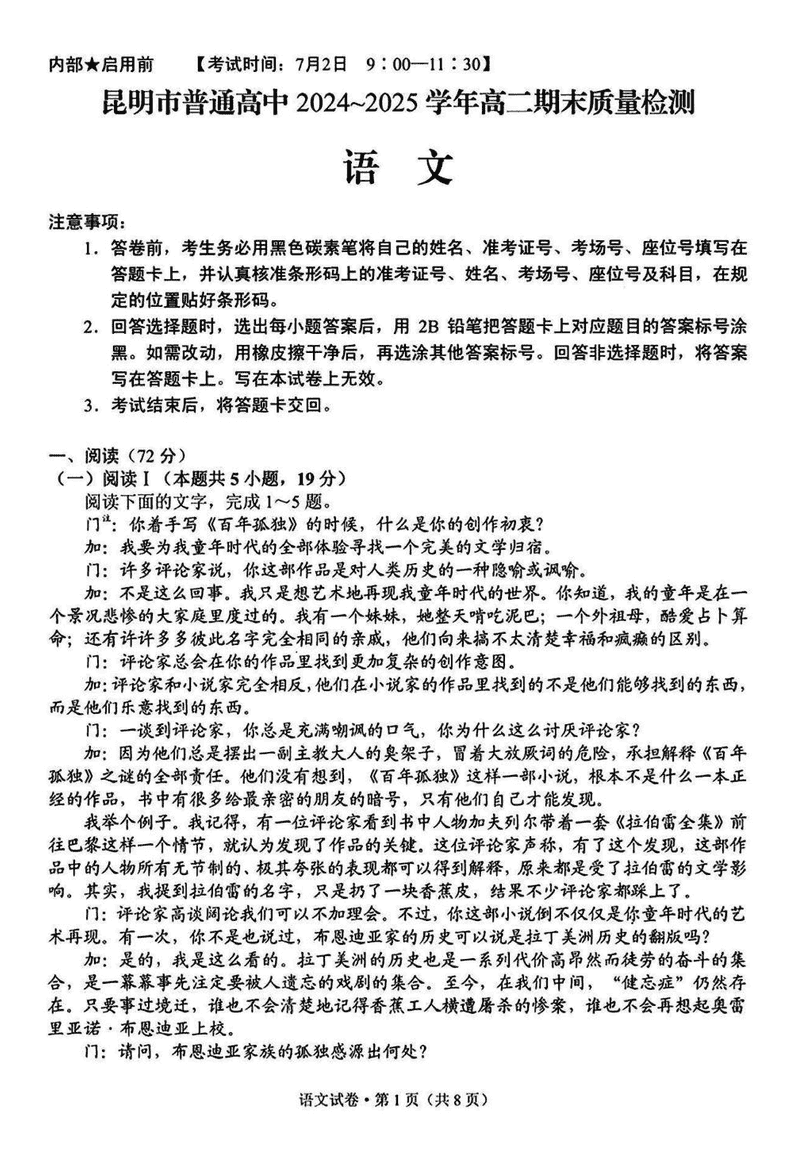 昆明市2024-2025学年高二下学期期末语文试题及答案 时间:2025-07-08 云南 高中语文 云南省昆明市2024-2025学年高二下学期期末质量监测语文考试已于近日开考,为方便考生考后及时查看考试情况,查漏补缺、弥补不足,本文整理了试题答案解析相关信息! 语文试题及答案解析