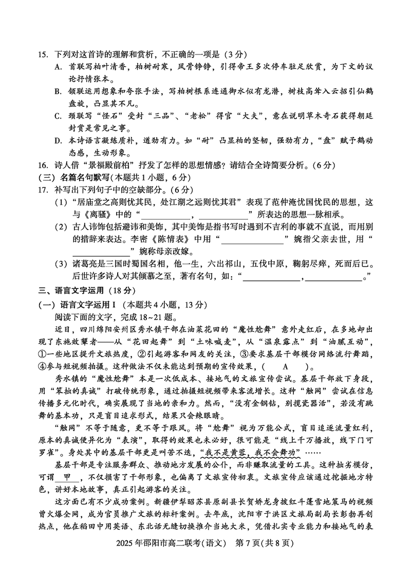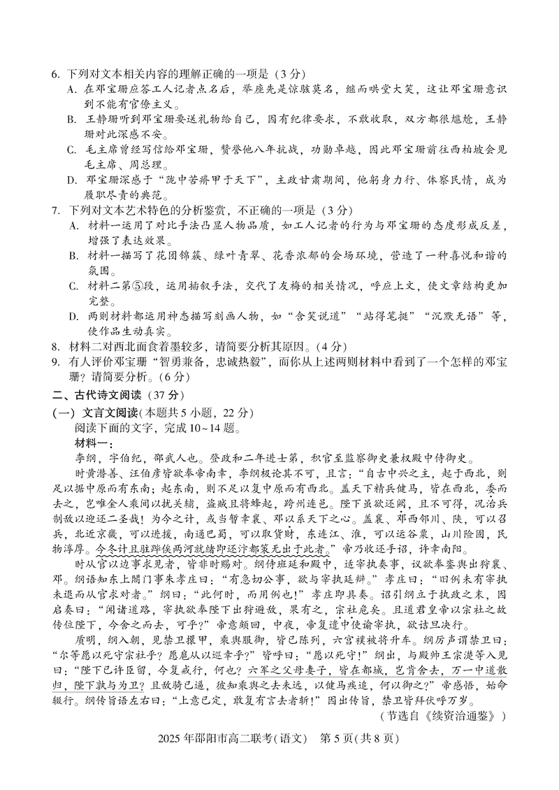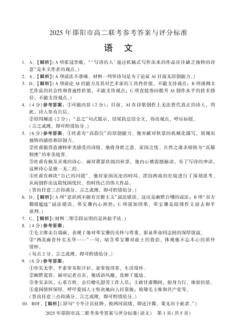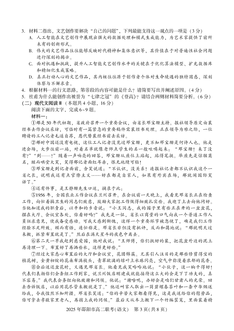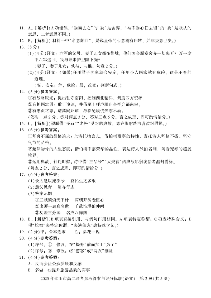 湖南邵阳2025年高二7月期末联考语文试题及答案 时间:2025-07-08 湖南 高中语文 湖南省邵阳市2025年高二下学期7月期末联考语文考试已于近日开考,为方便考生考后及时查看考试情况,查漏补缺、弥补不足,本文整理了试题答案解析相关信息! 语文试题及答案解析