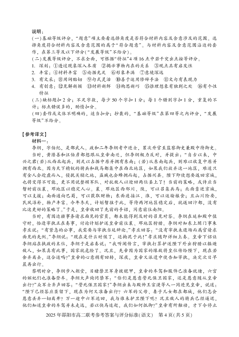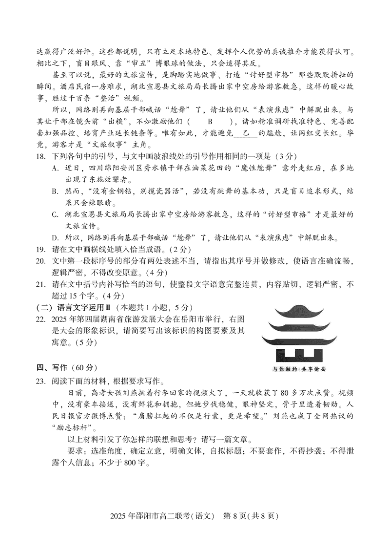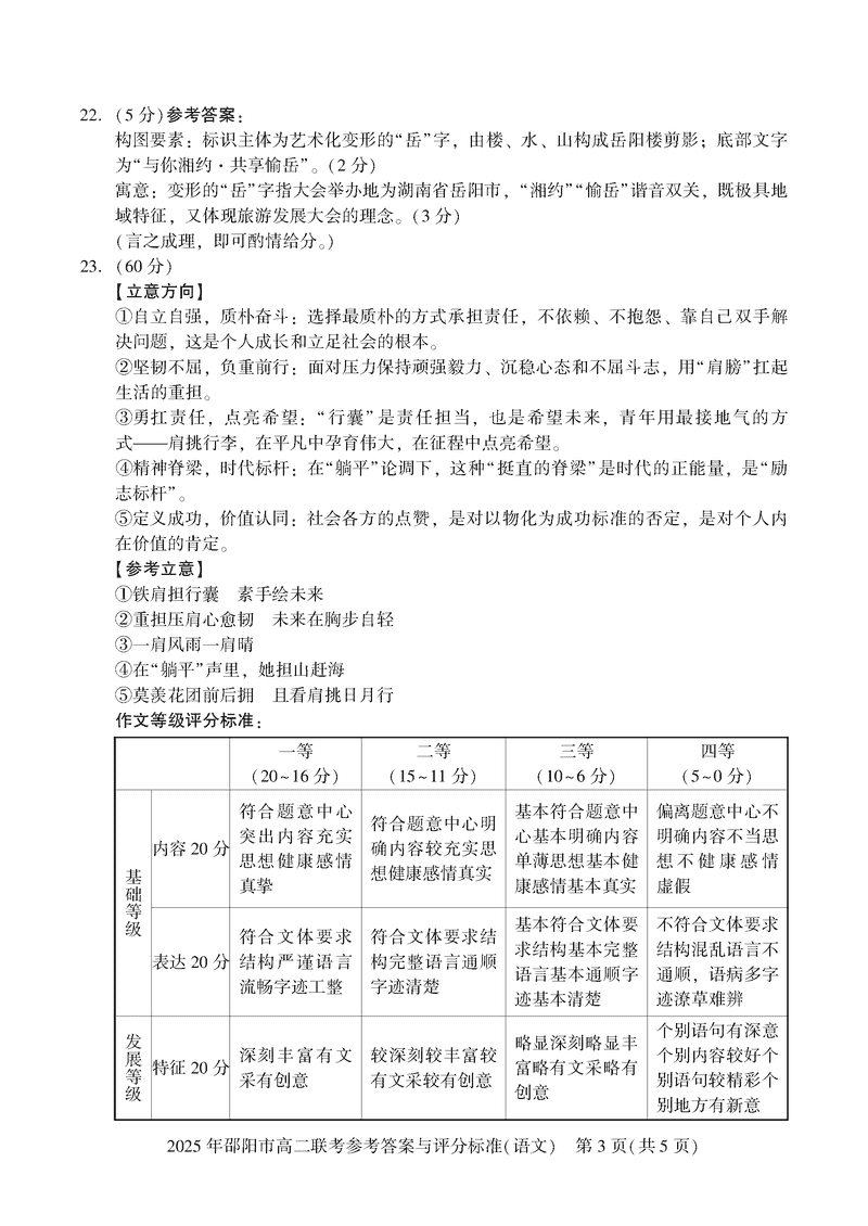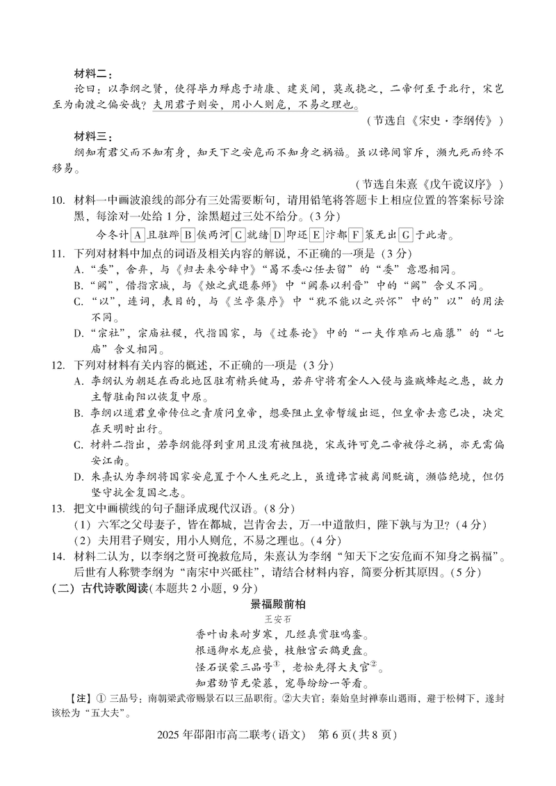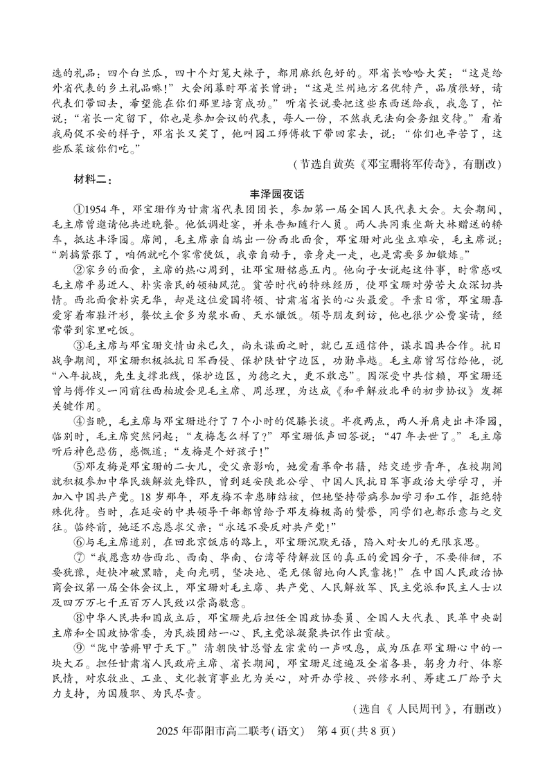 湖南邵阳2025年高二7月期末联考语文试题及答案 时间:2025-07-08 湖南 高中语文 湖南省邵阳市2025年高二下学期7月期末联考语文考试已于近日开考,为方便考生考后及时查看考试情况,查漏补缺、弥补不足,本文整理了试题答案解析相关信息! 语文试题及答案解析
