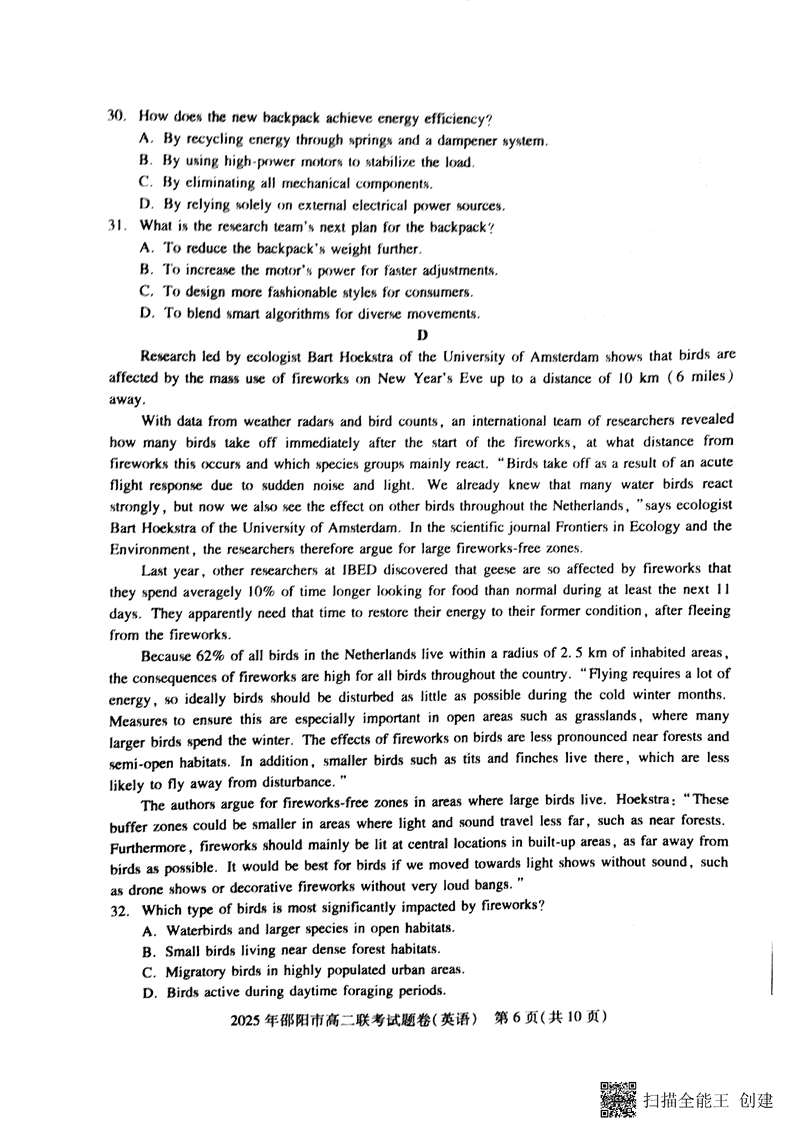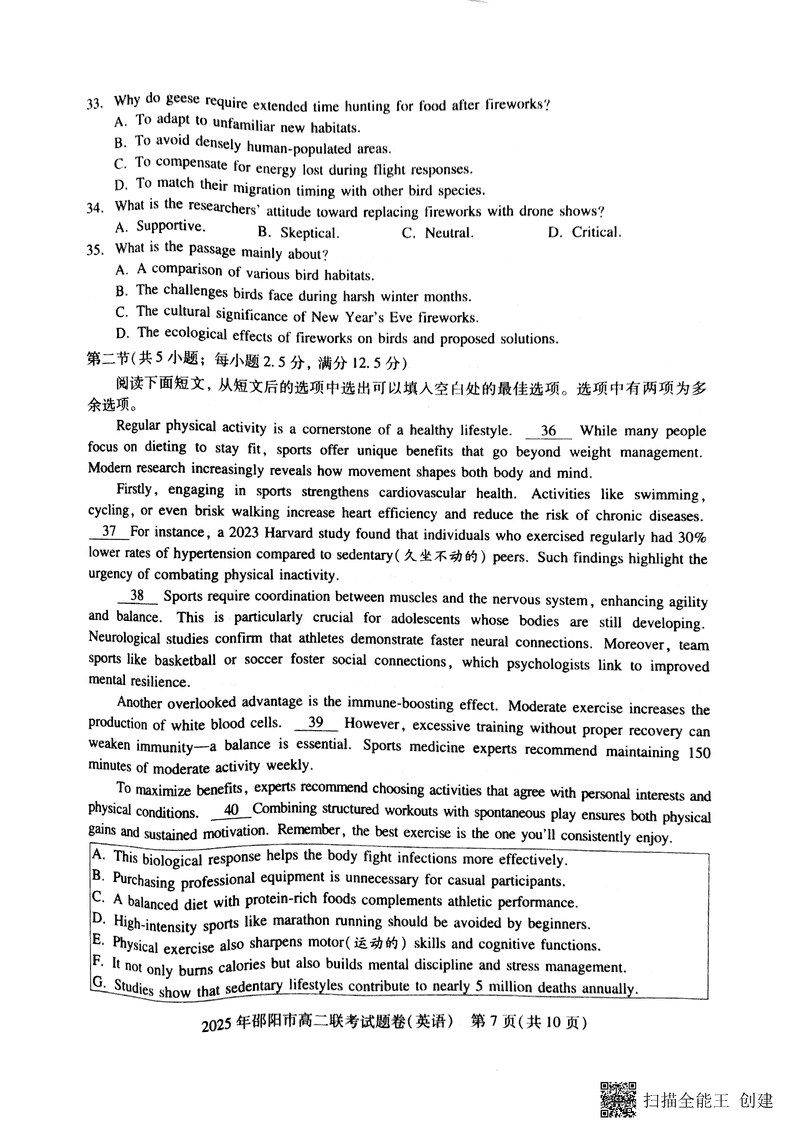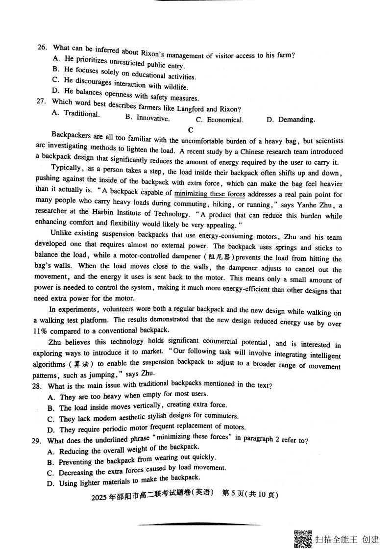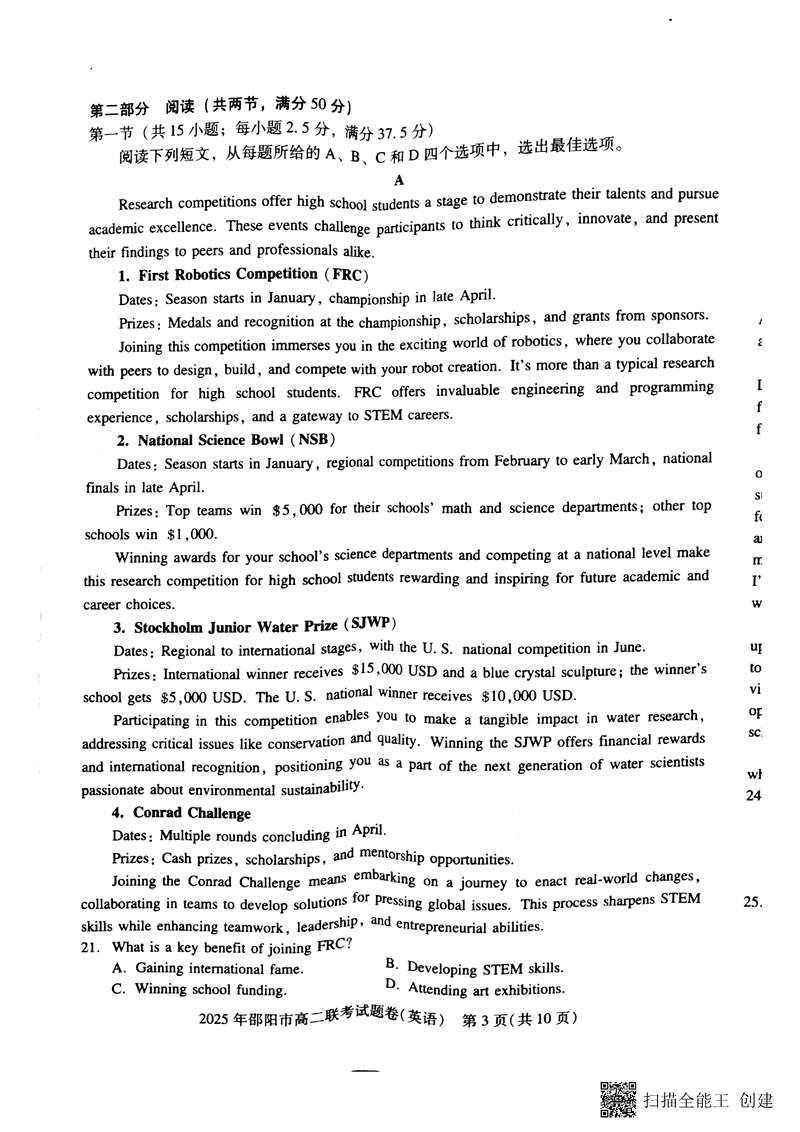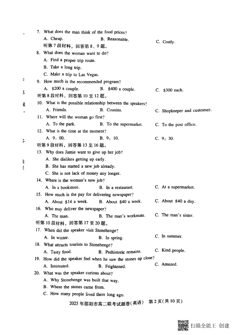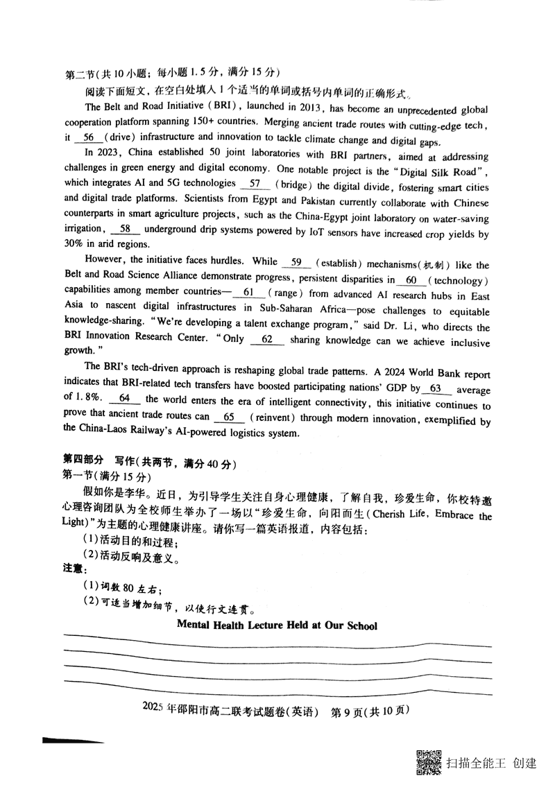 湖南邵阳2025年高二7月期末联考英语试题及答案 时间:2025-07-08 湖南 高中英语 湖南省邵阳市2025年高二下学期7月期末联考英语考试已于近日开考,为方便考生考后及时查看考试情况,查漏补缺、弥补不足,本文整理了试题答案解析相关信息! 英语试题及答案解析