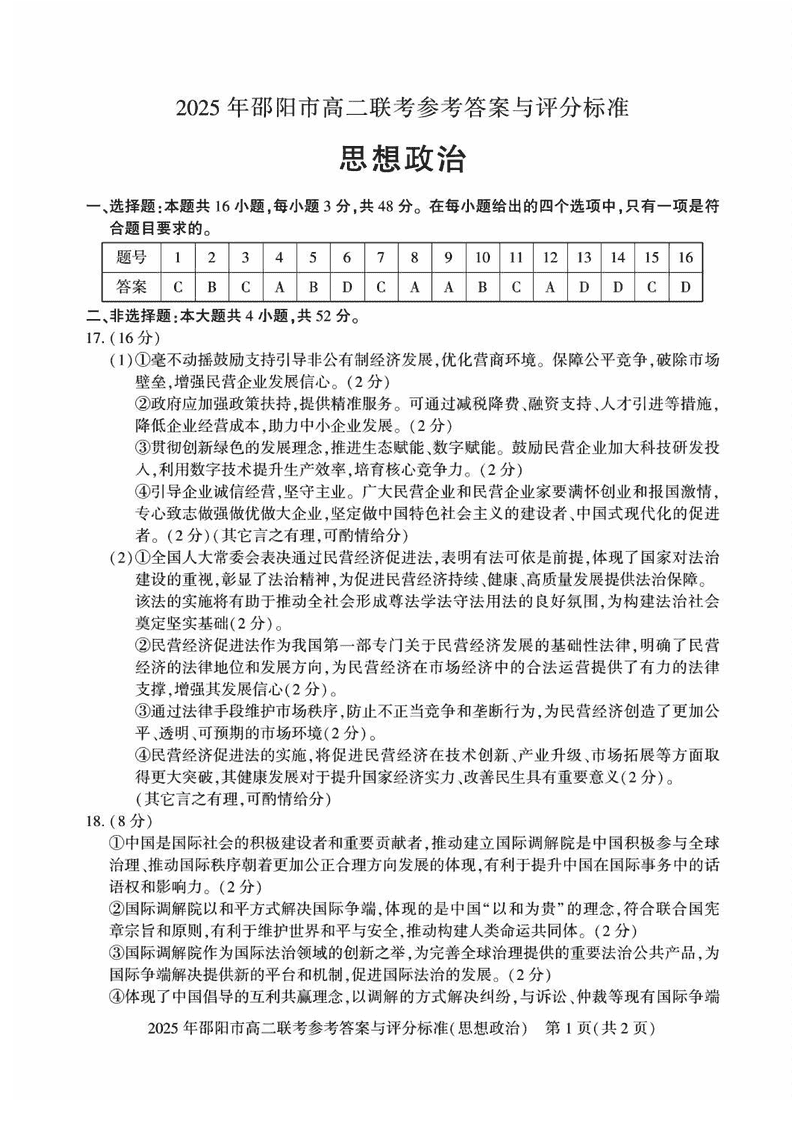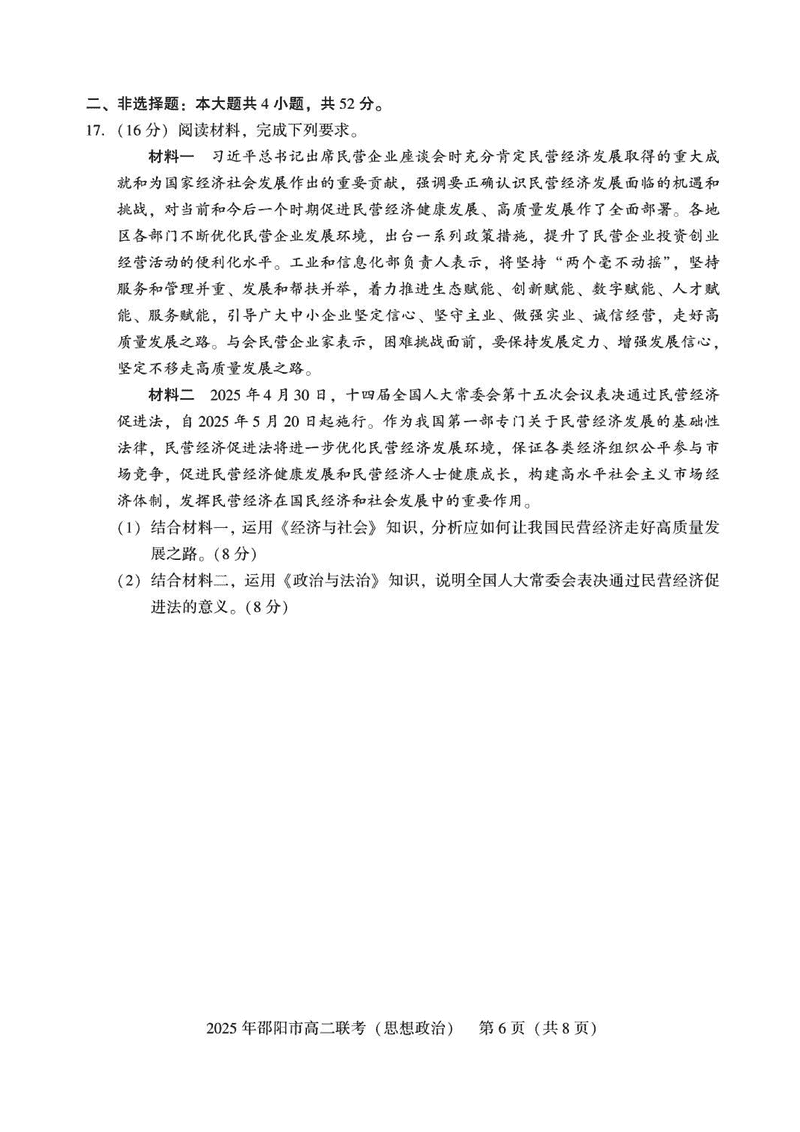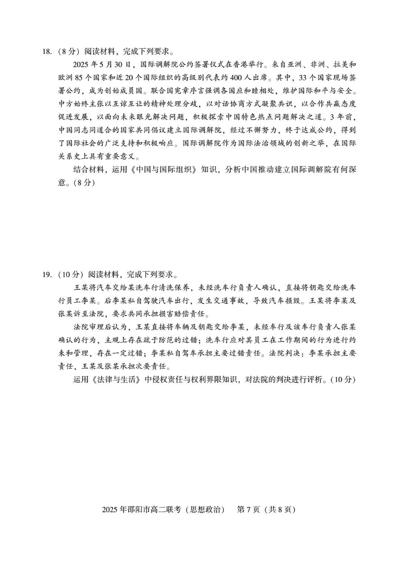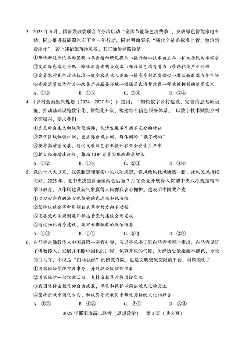 湖南邵阳2025年高二7月期末联考政治试题及答案 时间:2025-07-08 湖南 高中政治 湖南省邵阳市2025年高二下学期7月期末联考政治考试已于近日开考,为方便考生考后及时查看考试情况,查漏补缺、弥补不足,本文整理了试题答案解析相关信息! 政治试题及答案解析