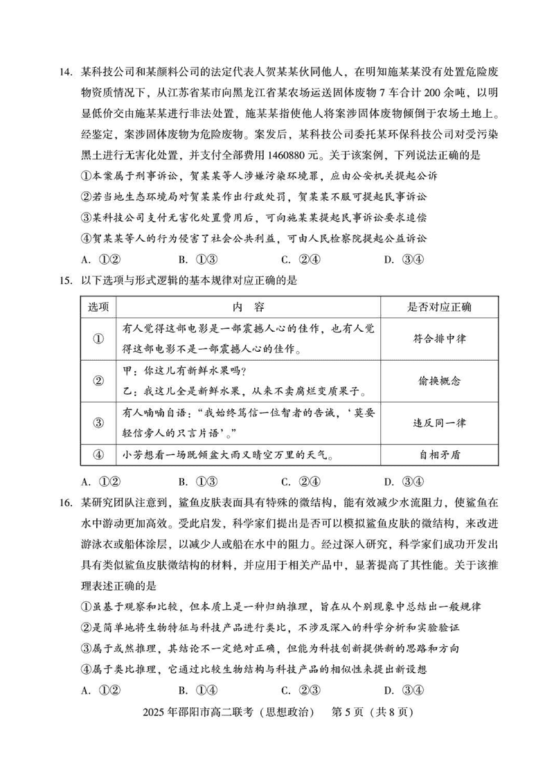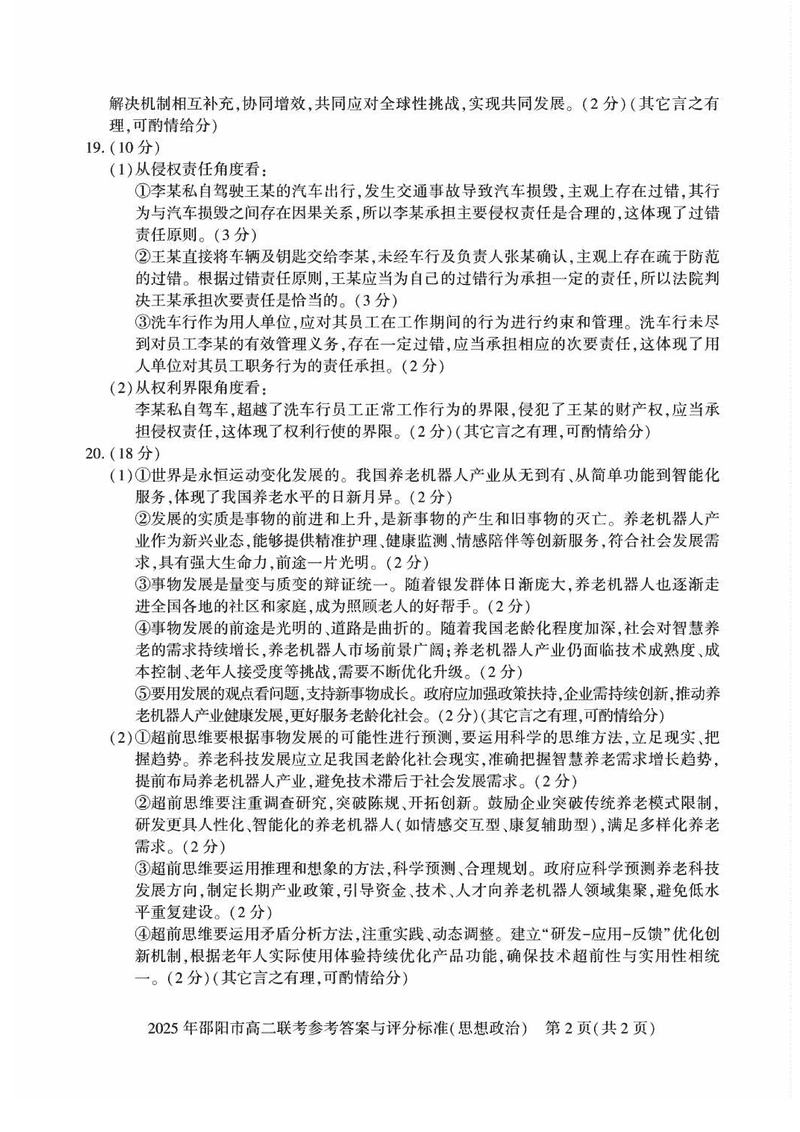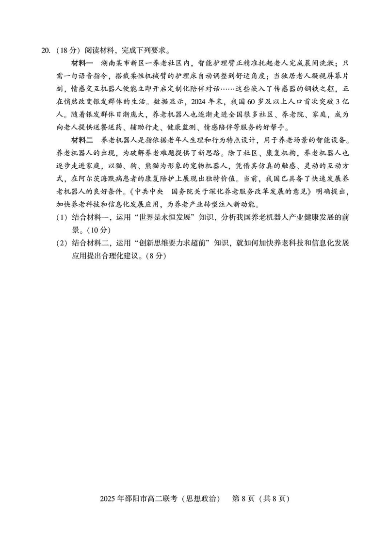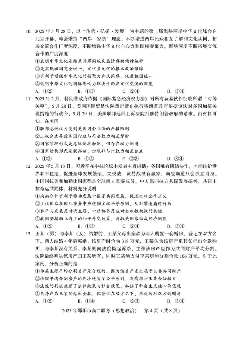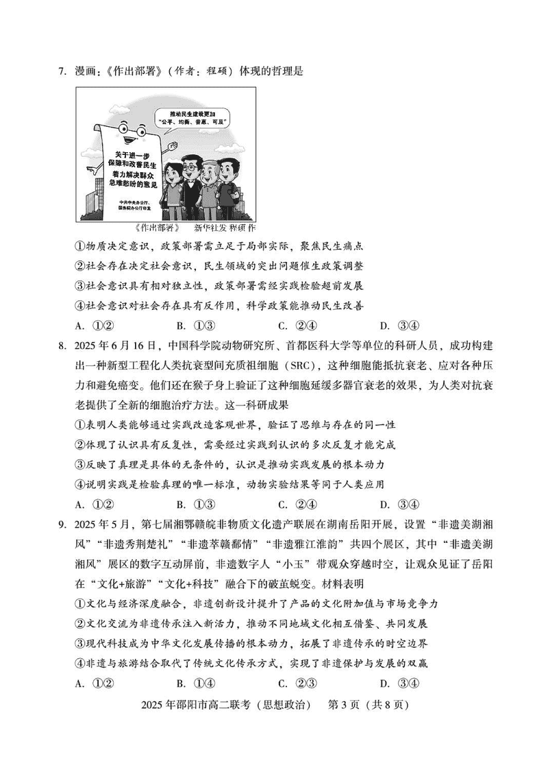 湖南邵阳2025年高二7月期末联考政治试题及答案 时间:2025-07-08 湖南 高中政治 湖南省邵阳市2025年高二下学期7月期末联考政治考试已于近日开考,为方便考生考后及时查看考试情况,查漏补缺、弥补不足,本文整理了试题答案解析相关信息! 政治试题及答案解析