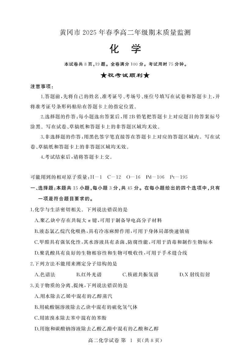 黄冈市2025年高二下学期期末化学试题及答案 时间:2025-07-08 湖北 高中化学 湖北省黄冈市2024-2025学年高二下学期期末质量监测化学考试已于近日开考,为方便考生考后及时查看考试情况,查漏补缺、弥补不足,本文整理了试题答案解析相关信息! 化学试题及答案解析