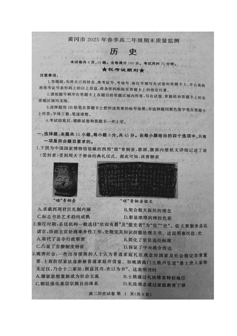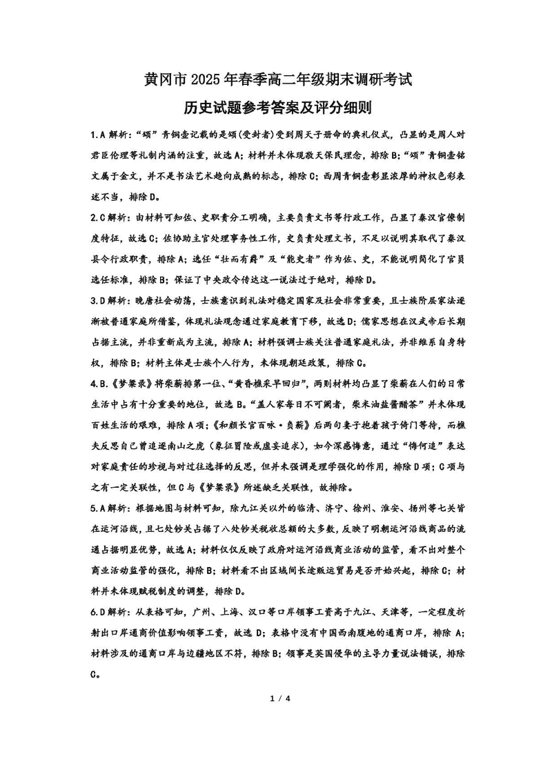 黄冈市2025年高二下学期期末历史试题及答案 时间:2025-07-08 湖北 高中历史 湖北省黄冈市2024-2025学年高二下学期期末质量监测历史考试已于近日开考,为方便考生考后及时查看考试情况,查漏补缺、弥补不足,本文整理了试题答案解析相关信息! 历史试题及答案解析
