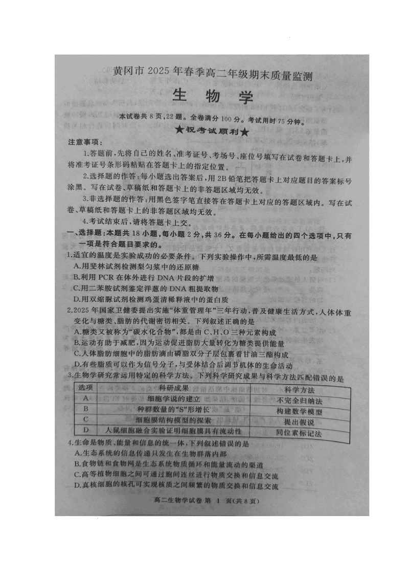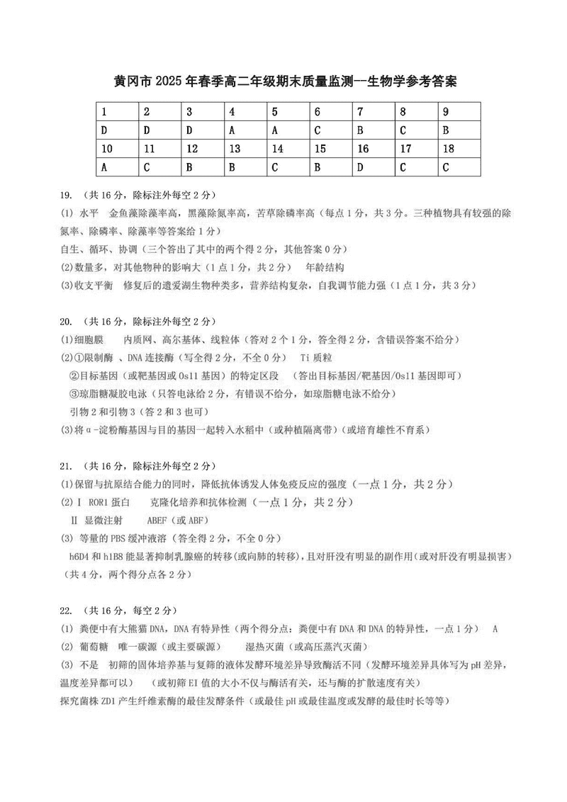 黄冈市2025年高二下学期期末生物试题及答案 时间:2025-07-08 湖北 高中生物 湖北省黄冈市2024-2025学年高二下学期期末质量监测生物考试已于近日开考,为方便考生考后及时查看考试情况,查漏补缺、弥补不足,本文整理了试题答案解析相关信息! 生物试题及答案解析