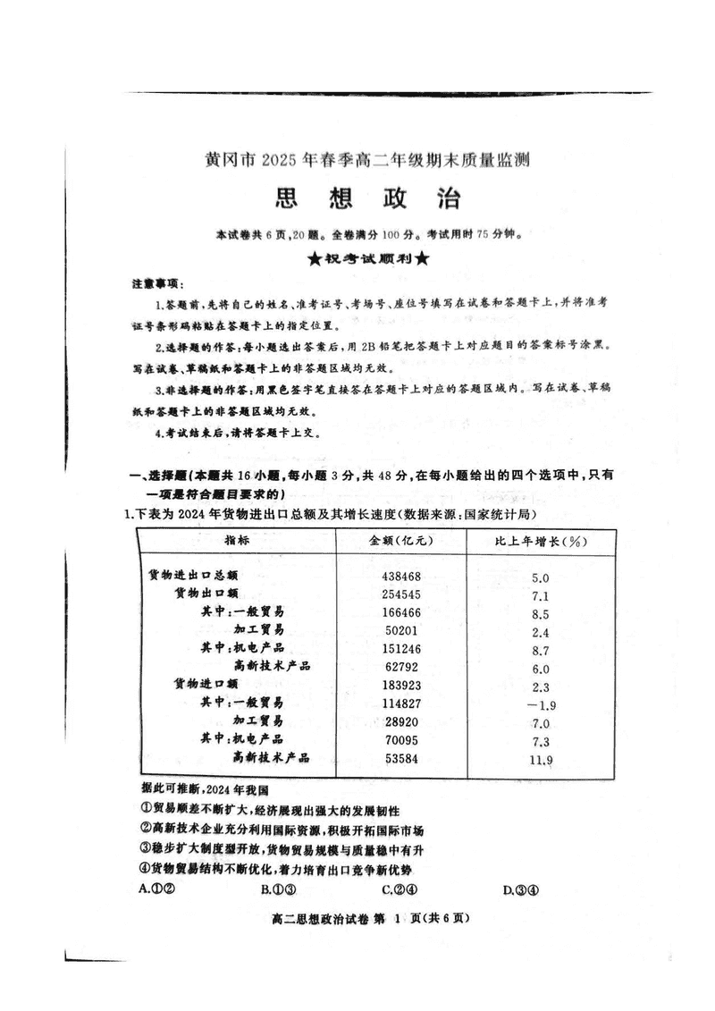 黄冈市2025年高二下学期期末政治试题及答案 时间:2025-07-08 湖北 高中政治 湖北省黄冈市2024-2025学年高二下学期期末质量监测政治考试已于近日开考,为方便考生考后及时查看考试情况,查漏补缺、弥补不足,本文整理了试题答案解析相关信息! 政治试题及答案解析