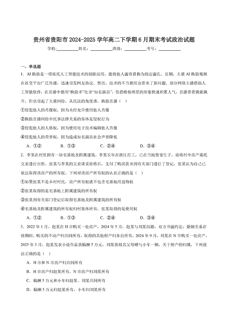 贵阳市2024-2025学年高二下学期6月期末政治试题及答案 时间:2025-07-08 贵州 高中政治 贵州省贵阳市2024-2025学年高二下学期6月期末政治考试已于近日开考,为方便考生考后及时查看考试情况,查漏补缺、弥补不足,本文整理了试题答案解析相关信息! 政治试题及答案解析