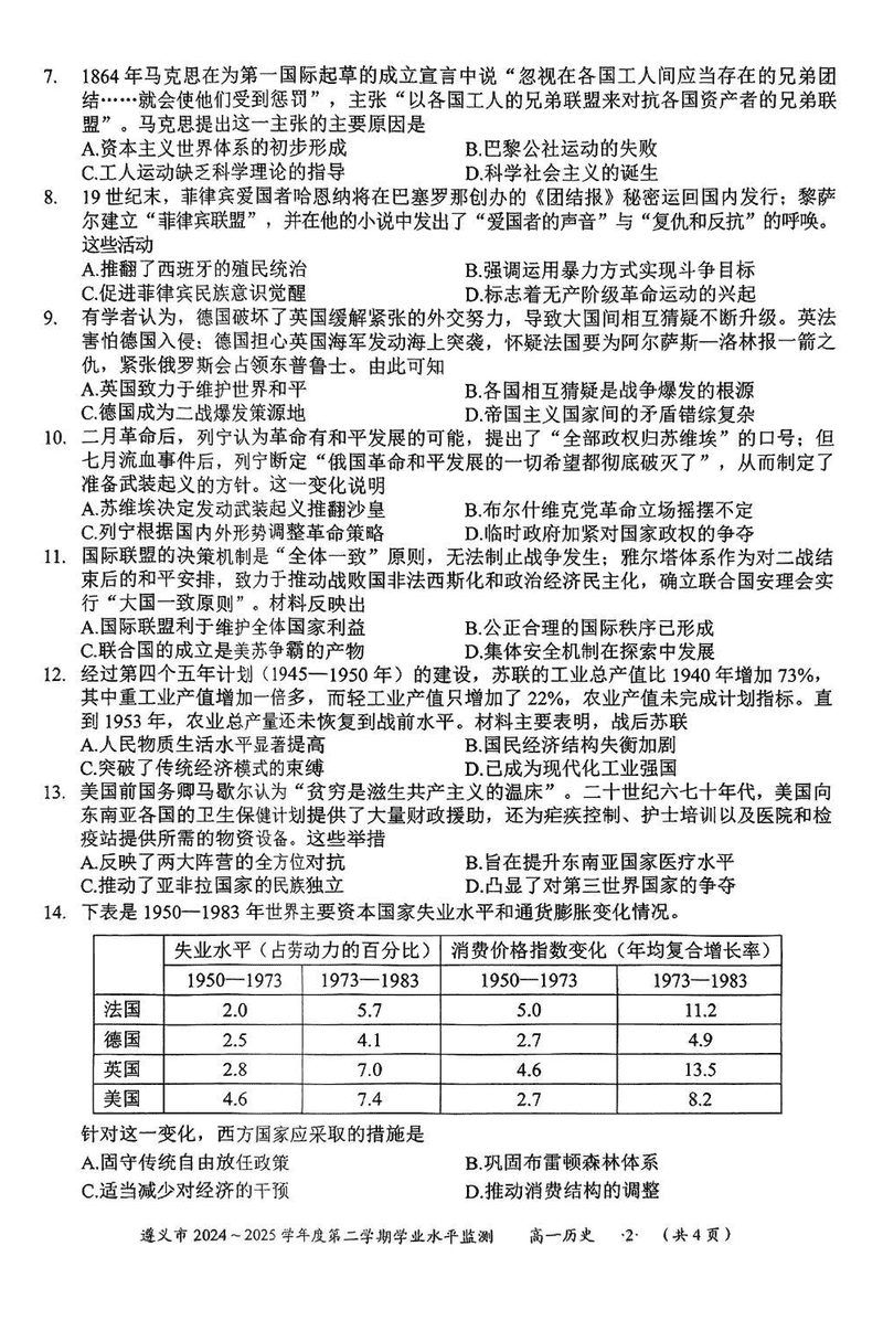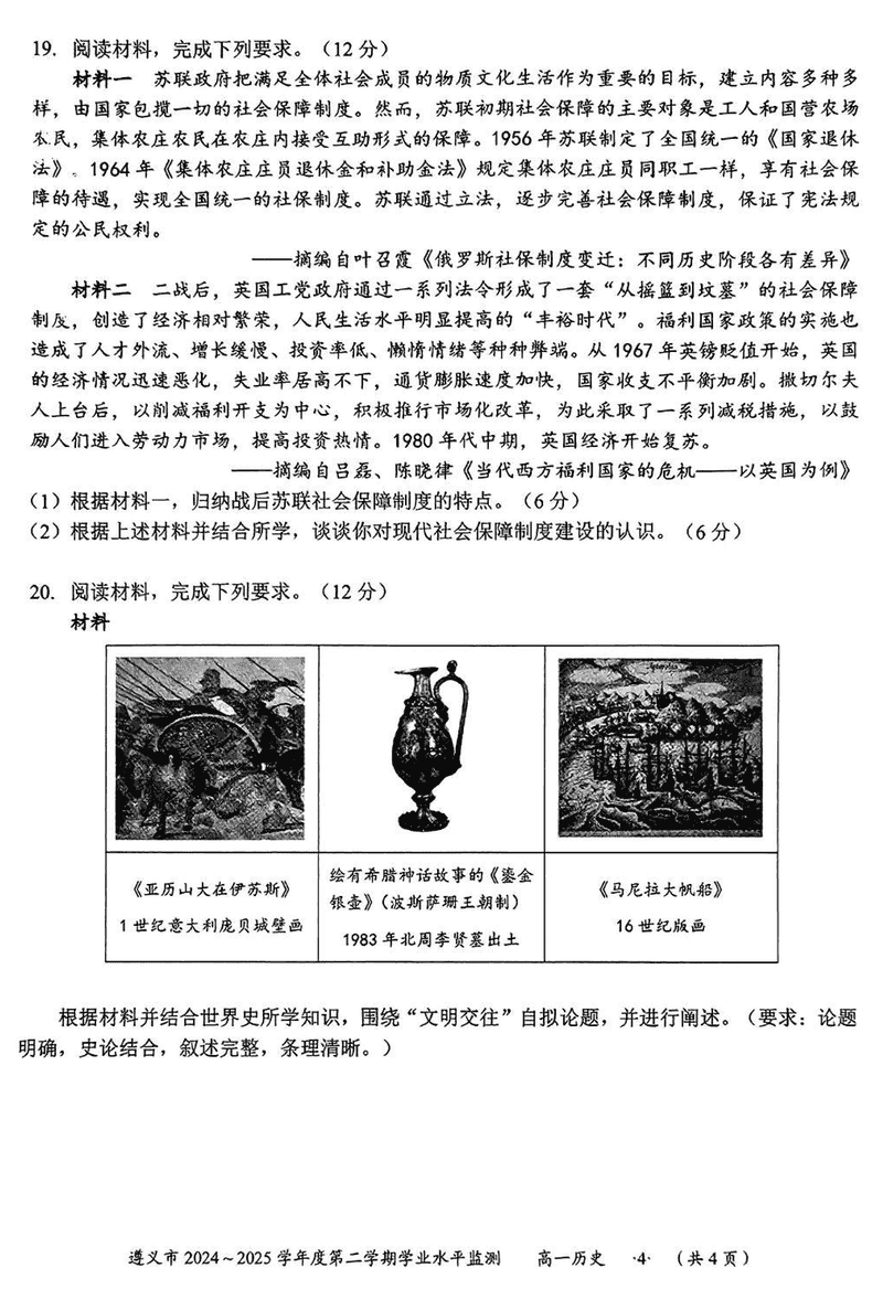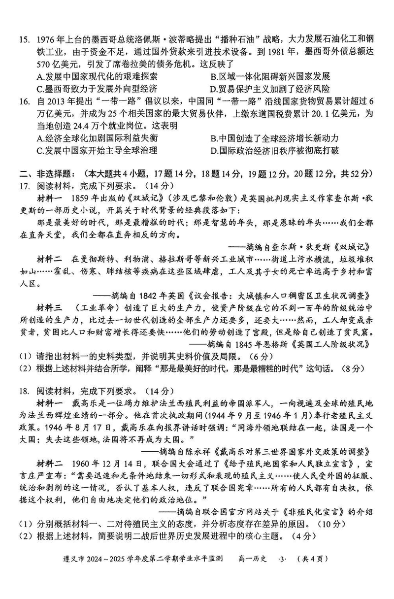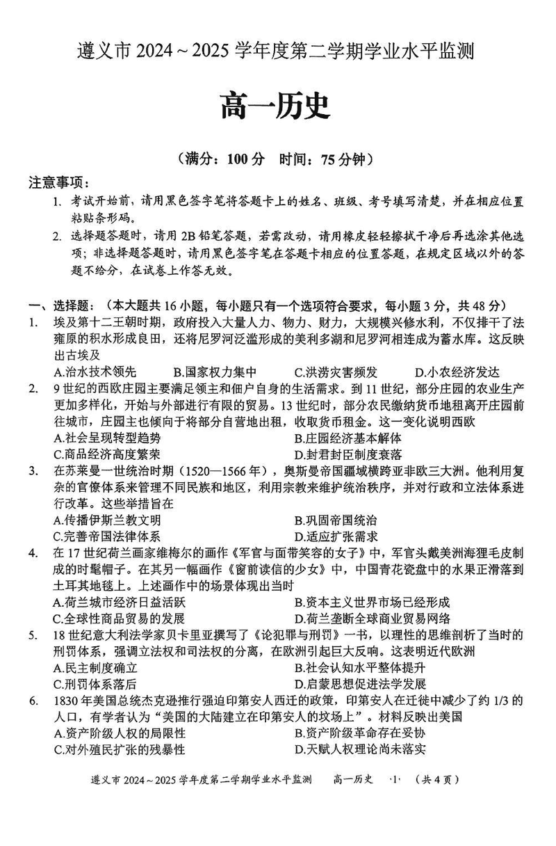 遵义市2024-2025学年高一下学期7月期末历史试题及答案 时间:2025-07-08 贵州 高中历史 贵州省遵义市2024-2025学年高一下学期7月期末学业水平监测历史考试已于近日开考,为方便考生考后及时查看考试情况,查漏补缺、弥补不足,本文整理了试题答案解析相关信息! 历史试题及答案解析