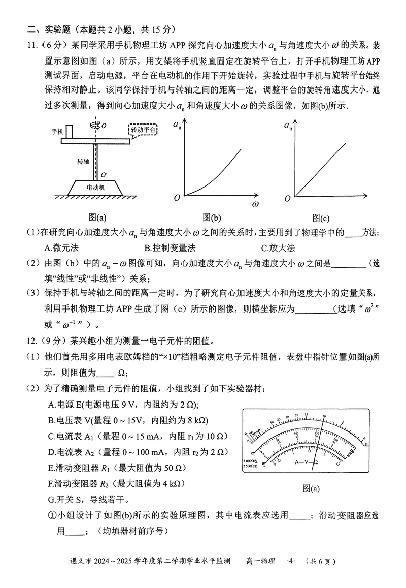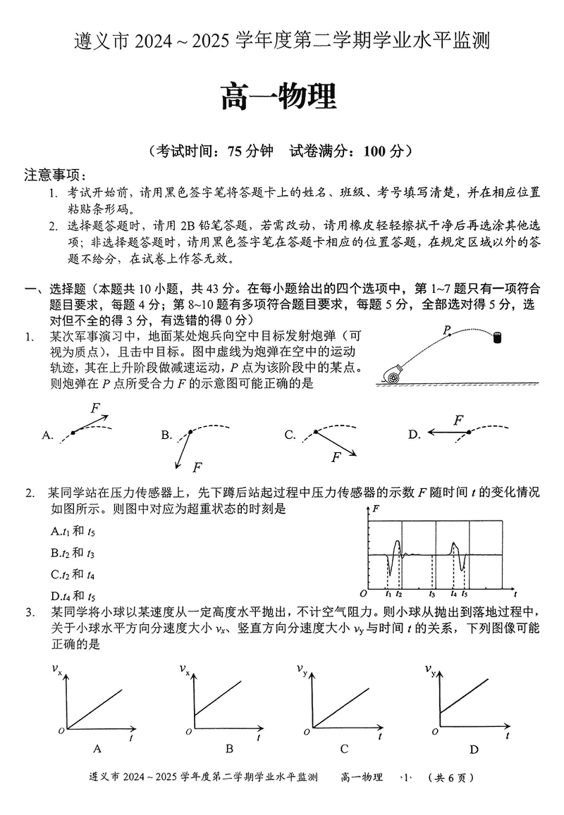 遵义市2024-2025学年高一下学期7月期末物理试题及答案 时间:2025-07-08 贵州 高中物理 贵州省遵义市2024-2025学年高一下学期7月期末学业水平监测物理考试已于近日开考,为方便考生考后及时查看考试情况,查漏补缺、弥补不足,本文整理了试题答案解析相关信息! 物理试题及答案解析