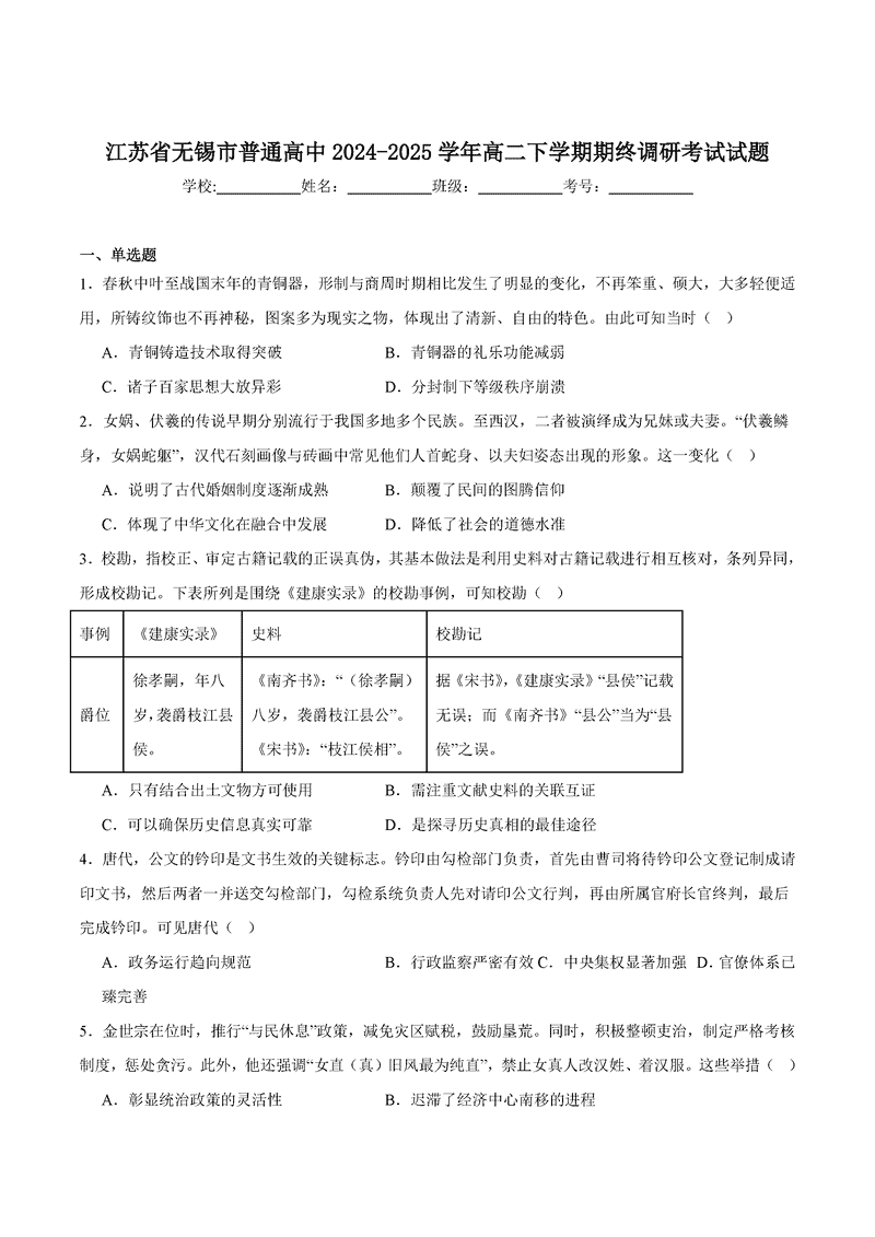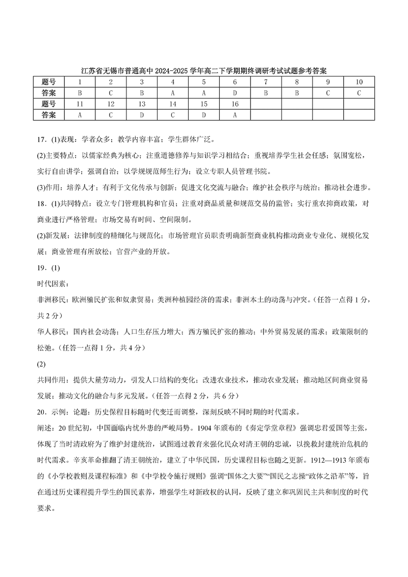 无锡市普通高中2025年春学期高二期终调研历史试题及答案 时间:2025-07-08 江苏 高中历史 江苏省无锡市普通高中2025年春学期高二期终调研历史考试已于近日开考,为方便考生考后及时查看考试情况,查漏补缺、弥补不足,本文整理了试题答案解析相关信息! 历史试题及答案解析